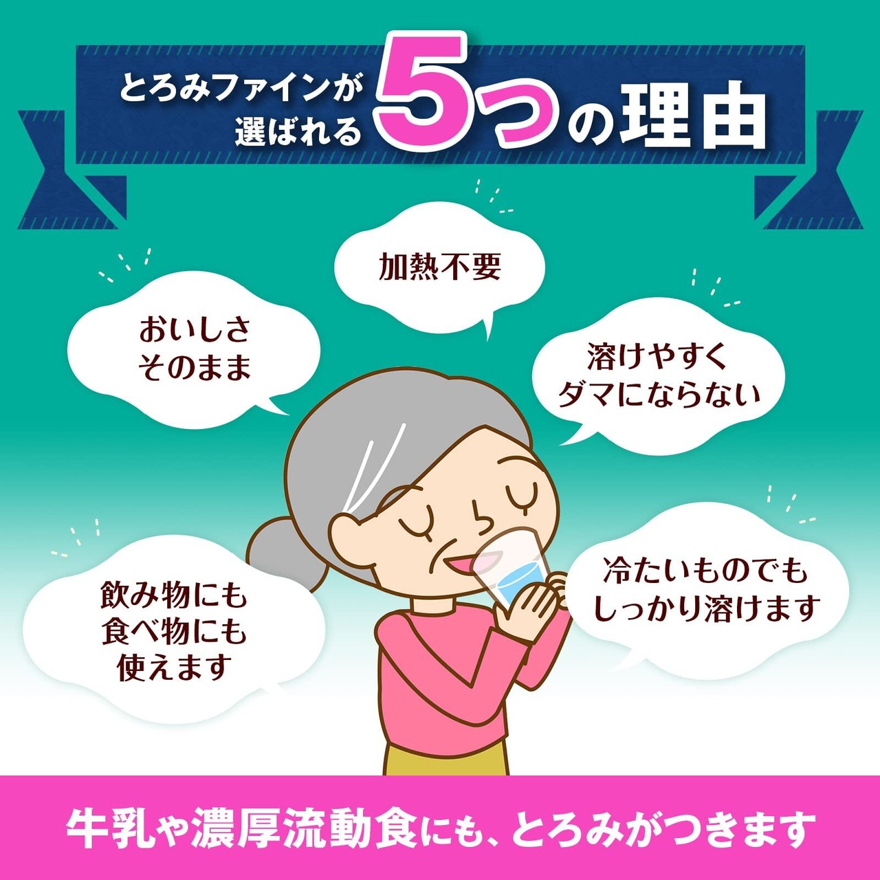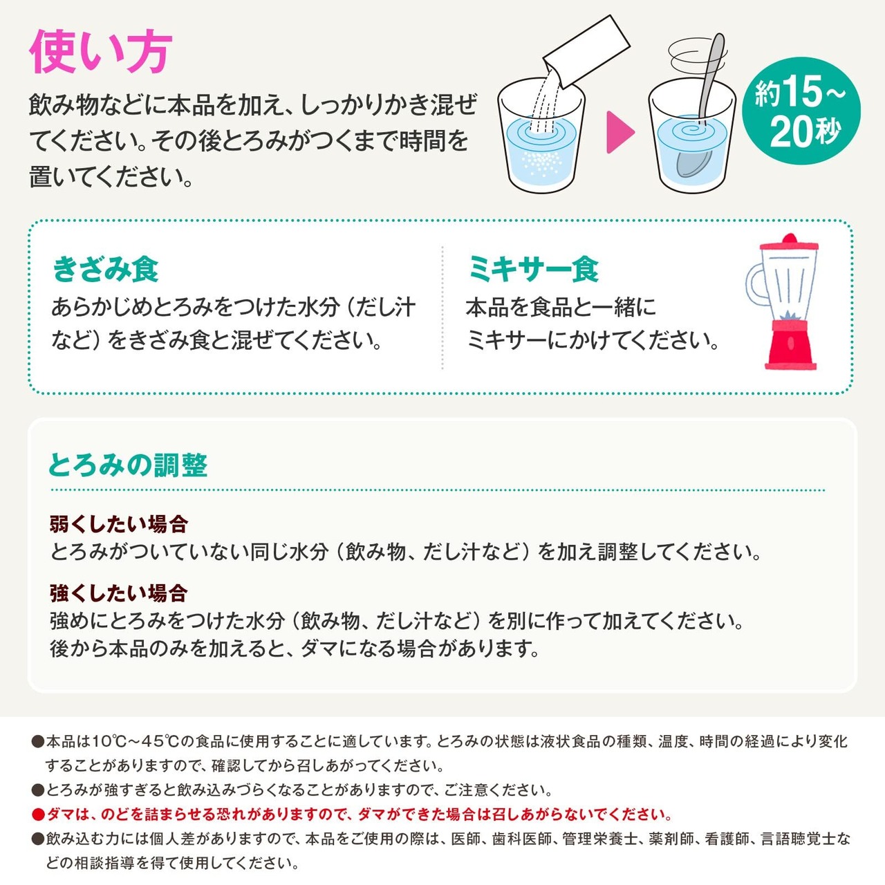 直射日光や高温多湿を避け保存。●とろみが弱い場合は、より強めにとろみをつけた水分(飲み物、だし汁など)を別に作って加えてください。後から本品のみを加えると、ダマになる場合があります。のどを詰まらせる恐れがありますので、ダマができた場合は召しあがらないでください。●飲み込む力には個人差がありますので、本品をご使用の際は、医師、栄養士に相談することをおすすめします。●個包装開封後は吸湿しやすいので、お早めに使い切ってください。●乳幼児向け商品ではありません。
