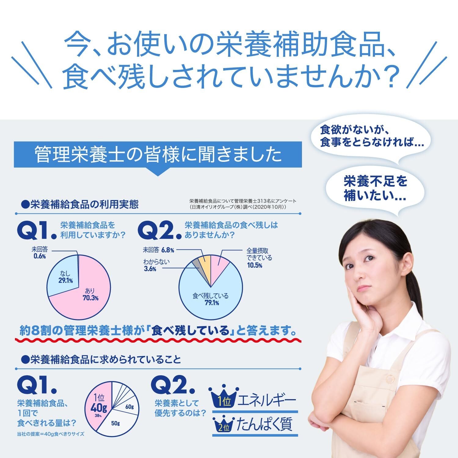 食べきれる40gで驚きの160kcal、MCT6g、たんぱく質3.5gを含んでいます。やわらかく、離水が少ない物性で、のみこみが困難な方にも食べやすくなっています。