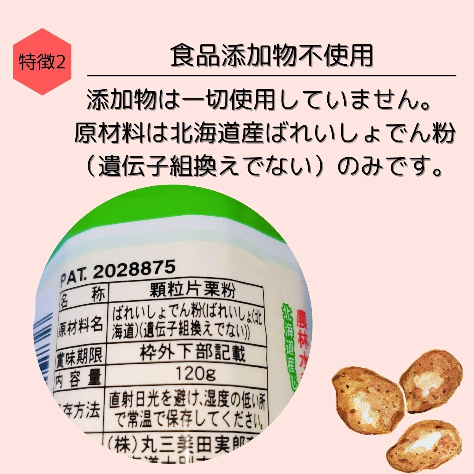 北海道産じゃがいもを100%使用した片栗粉を顆粒状にしました。顆粒にする際、添加物は一切使用していないので、安心して離乳食や介護食用としてトロミ付けできます。赤ちゃんからお年寄りまで、幅広い年代にご使用いただけます。