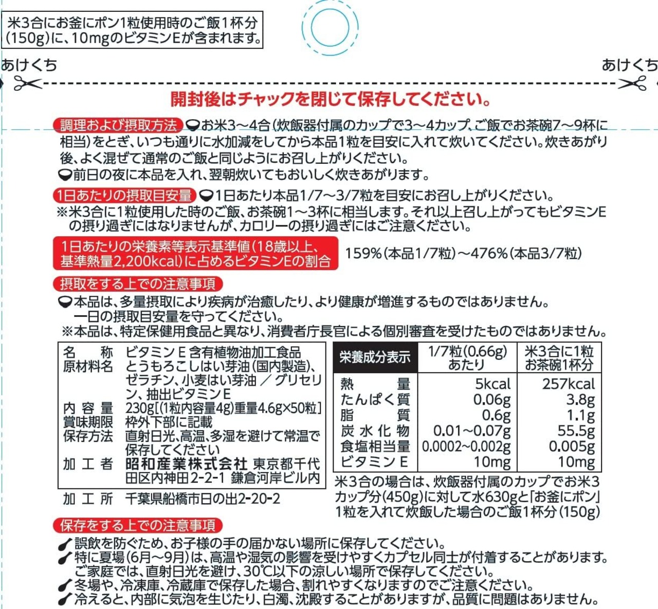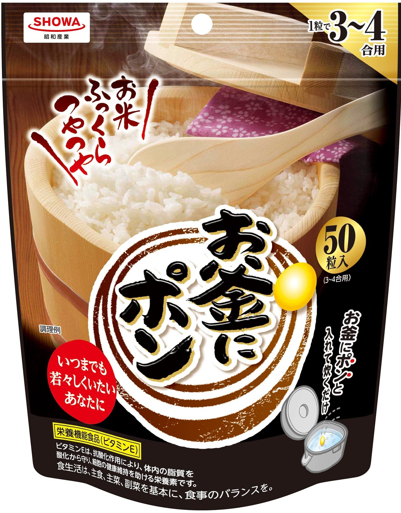 栄養機能性食品(ビタミンE)です。炊飯時にポンと1粒いれるだけ。お米がふっくらつやつや、おいしく炊き上がります。3~4合に一粒が目安です。