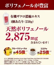 【栄養成分表示(100g当たり)】エネルギー 174.5kcal、たんぱく質 3.8g、脂質 0g、炭水化物 43.1g、食塩相当量 0g、カリウム 717mg/ポリフェノール 1150mg、エラグ酸 23mg、クエン酸 5140mg