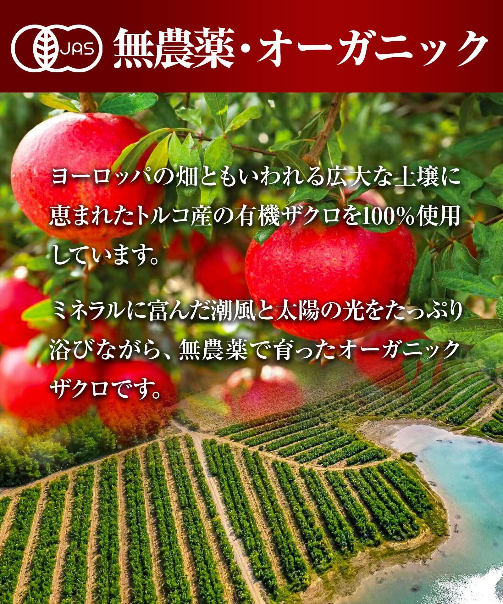 【商品特徴】原材料はトルコ産の有機ザクロのみ(ザクロジュース100パーセント)/有機JAS認証(オーガニック)/無農薬(残留農薬検査287項目全て不検出)/砂糖や着色料など添加物は一切不使用/日本国内の自社工場で充填(最終検品・容器詰め)/10倍濃縮なので好みの濃さに調整できる/パウチタイプなので軽量でゴミ捨てが簡単