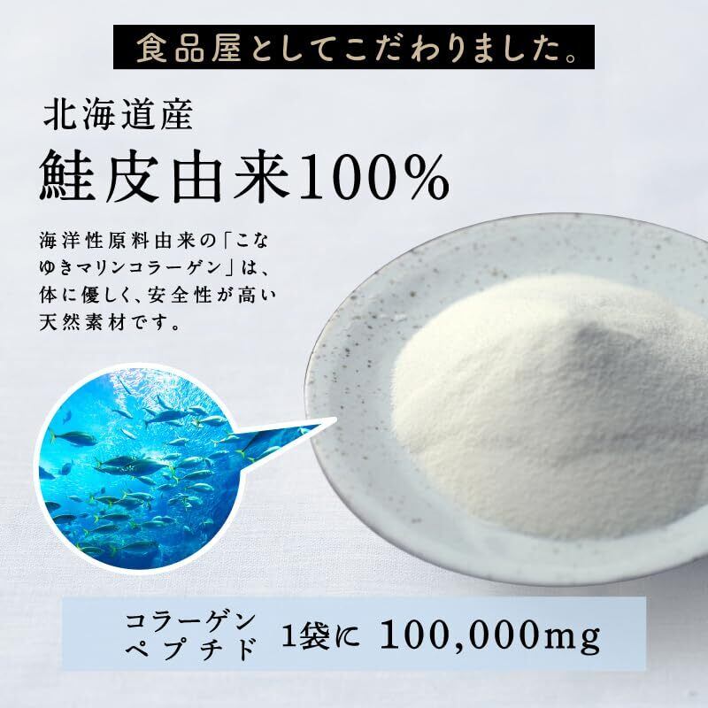 こなゆきマリンコラーゲンは、希少な北海道産の鮭皮を使用した、高級コラーゲンを使用しています。動物性アレルギーや宗教上で動物性がNGな方にも安心してお召し上がりいただけます。