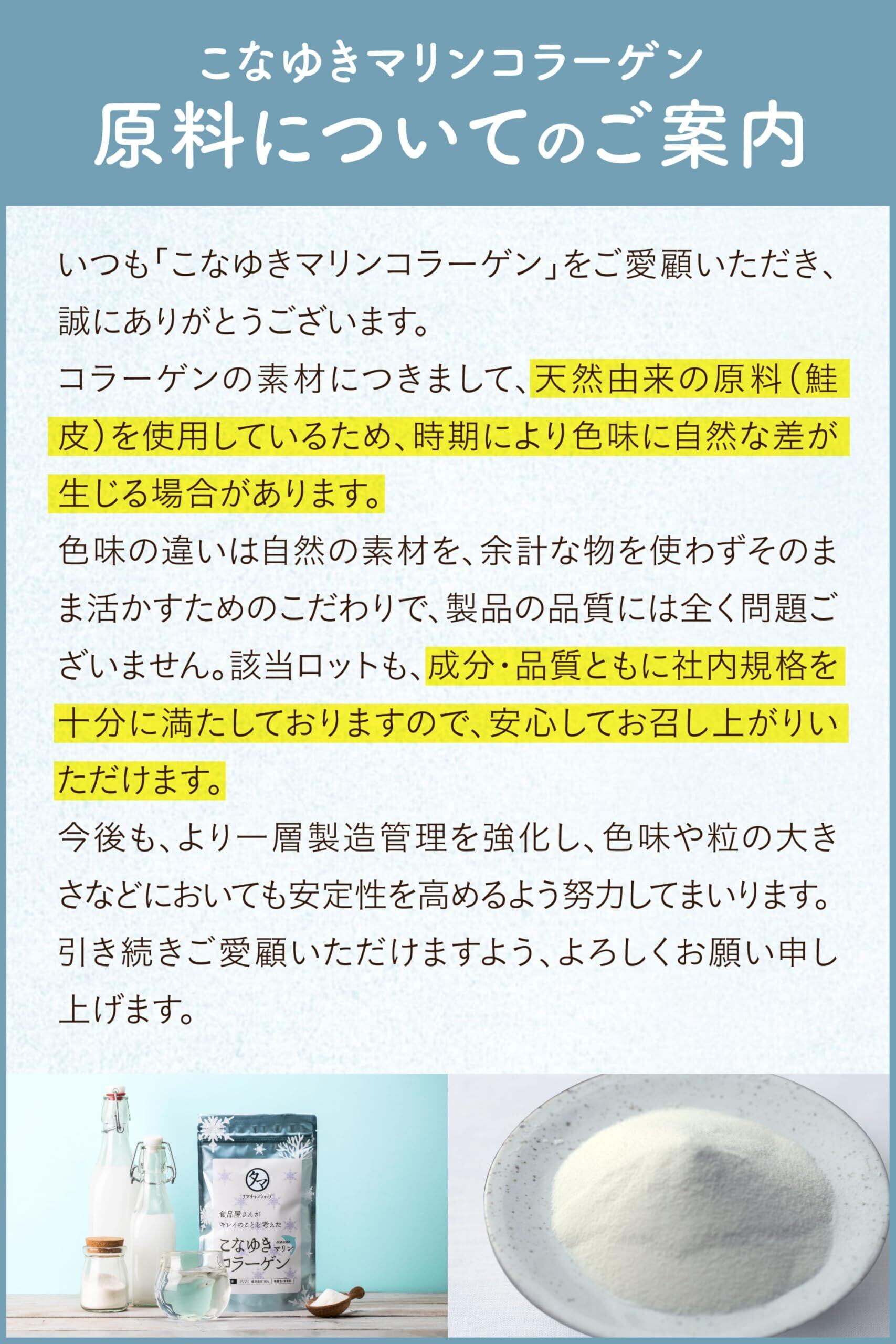 【こなゆきマリンコラーゲン】鮭皮由来の天然コラーゲンのため、時期により色味に差がある場合がございますが、品質に問題はありません。