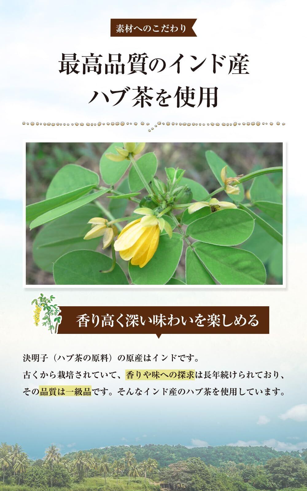 【素材へのこだわり】決明子(ハブ茶の原料)の原産であるインドでは古くより栽培されていて、香りや味への探求は長年行われています。そんなインド産の決明子を厳選して使用しています。