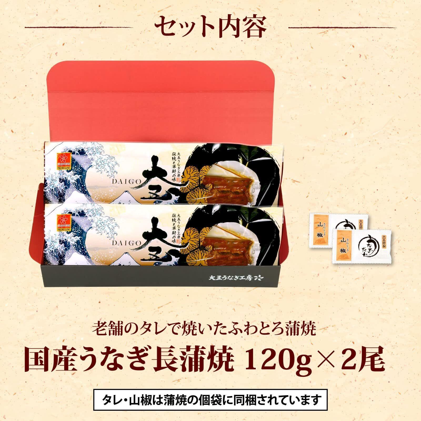 内容量:長蒲焼(約120g)×2尾、タレ・山椒小袋付、織物風呂敷包み、化粧箱付き