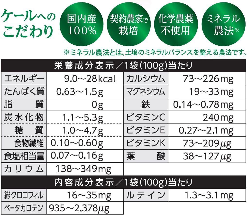 "1袋に1日分の緑黄色野菜量120g分ケール本来の味わいです。 産地は愛媛、鹿児島、長野の「契約農家」で栽培されたケールのみを使用。 産地が明示できるのは消費者にとって魅力であり、強みである。 ミネラル農法で育てると根が良く伸びて養分吸収が促され栄養豊富なケールが育つ! ≪ミネラル農法とは≫ ミネラルバランスを整えた健康な土壌で栽培する農法です。 ミネラル農法で作物を育てると、根っこの量も質も向上します。そのため栄養の吸収力にも違いが生まれます。一般的な農法に比べ、ケールの葉に含まれるカルシウム量が15%がアップするのです!"