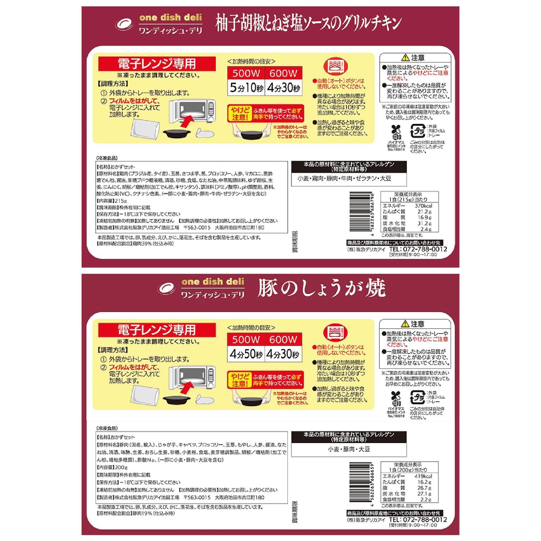 【おろしソースのハンバーグ】ハンバーグ(国内製造)、玉葱、じゃが芋、大根おろし、ブロッコリー、南瓜、人参、砂糖、ぽん酢調味料、ゆずマーマレード、なたね油、醤油、白だし、食塩、清酒、おろし生姜、麦芽糖調製品(一部に小麦・卵・乳成分・鶏肉・豚肉・牛肉・大豆を含む)【オニオンソースのグリルチキン】鶏肉(ブラジル産、タイ産)、玉葱、さつま芋、醤油、マカロニ、南瓜、ブロッコリー、人参、清酒、砂糖、馬鈴薯でん粉、おろしりんご、果糖ブドウ糖液糖、味醂、りんご酢、おろしにんにく、食塩、胡椒(一部に小麦・りんご・鶏肉・大豆を含む)【柚子胡椒とねぎ塩ソースのグリルチキン】鶏肉(ブラジル産、タイ産)、玉葱、さつま芋、葱、ブロッコリー、人参、マカロニ、馬鈴薯でん粉、醤油、果糖ブドウ糖液糖、清酒、砂糖、食塩、なたね油、中華風調味料、ゆず胡椒、生姜、にんにく、胡椒(一部に小麦・鶏肉・豚肉・牛肉・ゼラチン・大豆を含む)【豚のしょうが焼】豚肉(国産、輸入)、じゃが芋、キャベツ、ブロッコリー、玉葱、もやし、人参、醤油、なたね油、清酒、味醂、生姜、おろし生姜、砂糖、小麦粉、食塩、麦芽糖調製品、胡椒(一部に小麦・豚肉・大豆を含む)【豚しゃぶのおろしポン酢】豚肉(国産、輸入)、もやし、大根おろし、人参、青葱、じゃが芋、南瓜、オクラ、砂糖、ぽん酢調味料、小麦粉、ゆずマーマレード、醤油、食塩、白だし、清酒、なたね油、おろし生姜(一部に小麦・豚肉・大豆を含む)【白身魚と彩り野菜の和風あんかけ】キタノメヌケ(アメリカ産)、揚げ茄子、ピーマン(青・黄・赤)、馬鈴薯でん粉、ぶなしめじ、玉葱、なたね油、醤油、味醂、筍、焼きあごだし、人参、砂糖、清酒、だし(さば節、うるめ節、目近節、昆布、かつお節、あご節)、おろし生姜、食塩、胡椒(一部に小麦・さば・大豆を含む)