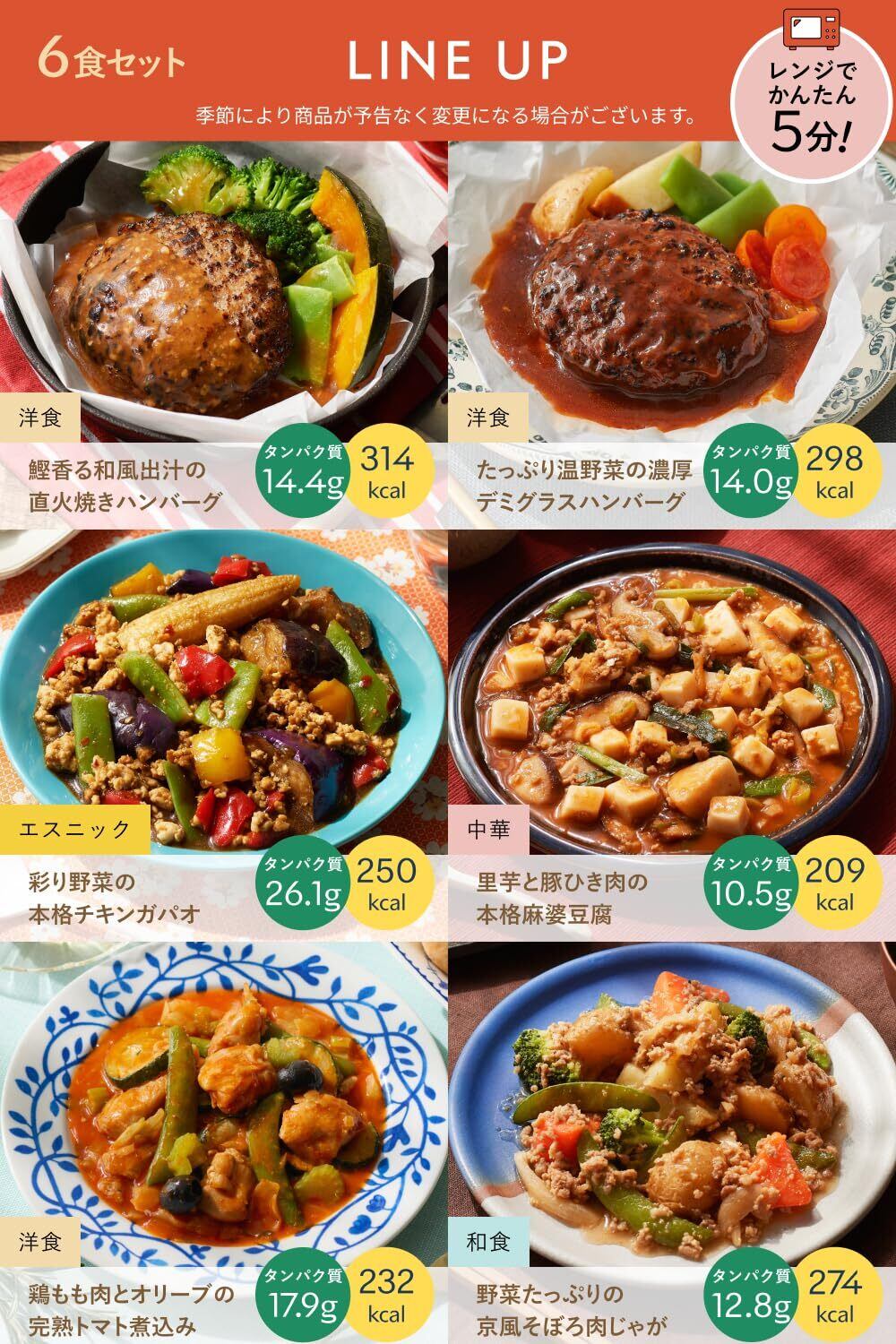 【商品詳細】おかずデリ6種 6食入。鰹香る和風出汁の直火焼きハンバーグ:302kcal, 彩り野菜の本格チキンガパオ:250kcal, 鶏もも肉とオリーブの完熟トマト煮込み:232kcal, 野菜たっぷりの京風そぼろ肉じゃが:274kcal, 里芋と豚ひき肉の本格麻婆豆腐:209kcal, たっぷり温野菜の濃厚デミグラスハンバーグ:312kcal。 賞味期限:製造日から179日。出荷時から1ヶ月以上。保存方法:要冷凍(-18℃以下)。