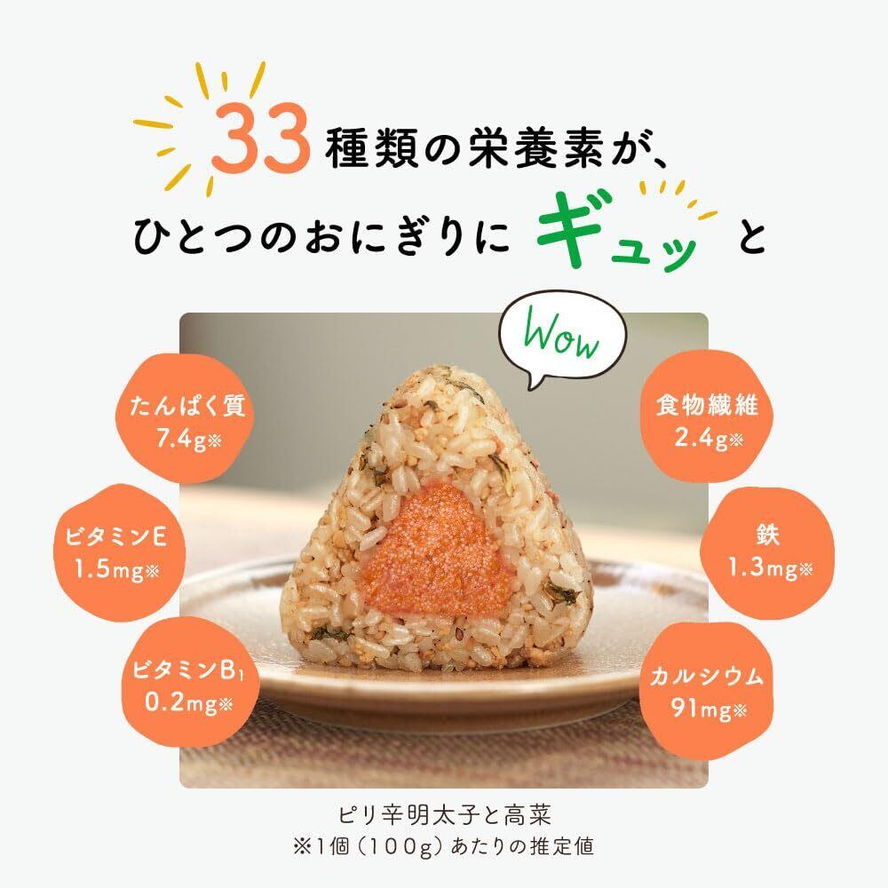 手軽に食べられるおにぎりに、糖質や、不足しがちな食物繊維、ビタミン、ミネラルなど現代人に必要な33種類の栄養素まで、バランスよくにぎり込みました。