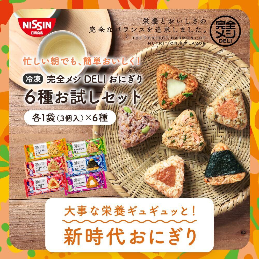 冷凍 完全メシ DELI 日清食品 おにぎり 冷凍おにぎり 6種お試しセット ほぐし鮭と大葉 紀州産梅と蒸し鶏 ツナマヨ味 五目ごはん ピリ辛明太子と高菜 ちりめん山椒と枝豆 コチュジャン香るビビンバ風 各1袋(3個入)× 6種