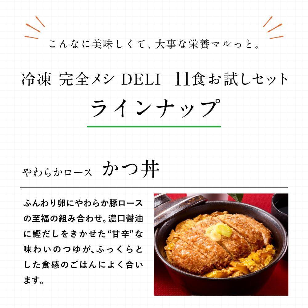 完全メシDELI 日清食品 バラエティ 11品セット かつ丼 牛丼 欧風カレーライス ナポリタン たらこパスタ ボロネーゼ 汁なし担々麺 デミオムライス チキンドリア 肉味噌まぜうどん お好み焼 特製ミックス玉 各1食 冷凍弁当 冷凍食品 たんぱく質 食物繊維