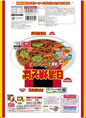 めん〔小麦粉(国内製造)、植物油脂、砂糖、食塩、卵粉、乳化油脂、醸造酢、粉末しょうゆ/加工でん粉、調味料(アミノ酸等)、かんすい、カラメル色素、アラビアガム、クチナシ色素、酸味料、パプリカ色素〕、味付キャベツ、砂糖、にんじん、豚脂、植物油脂、粉末ソース、香辛料、食塩/増粘剤(加工でん粉)、調味料(アミノ酸等)、香料、酸味料、カラメル色素、香辛料抽出物、酸化防止剤(ビタミンE)、甘味料(カンゾウ)、(一部に小麦・卵・乳成分・ごま・大豆・鶏肉・豚肉・りんごを含む)