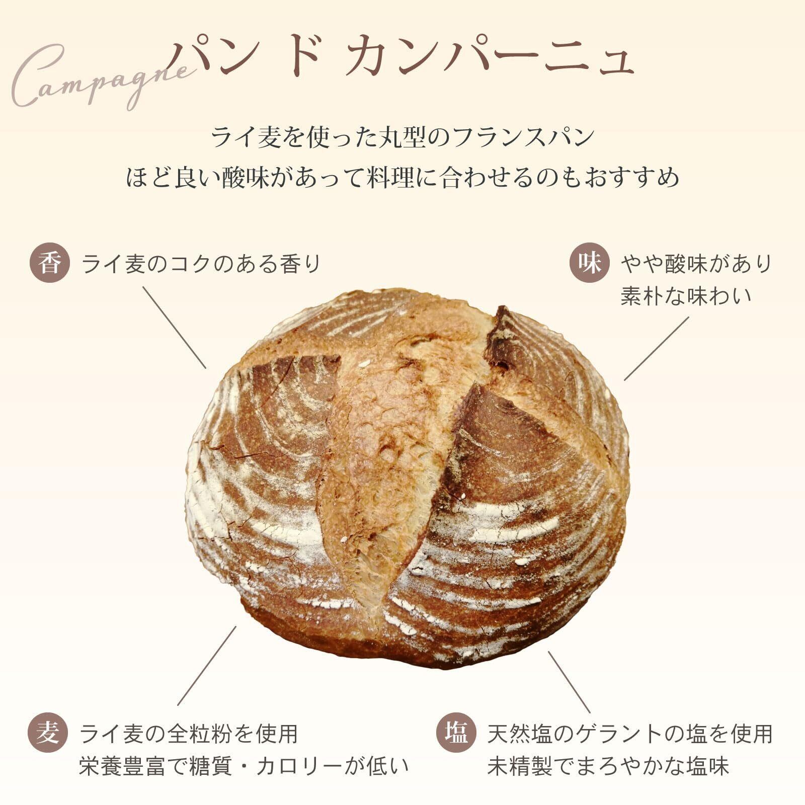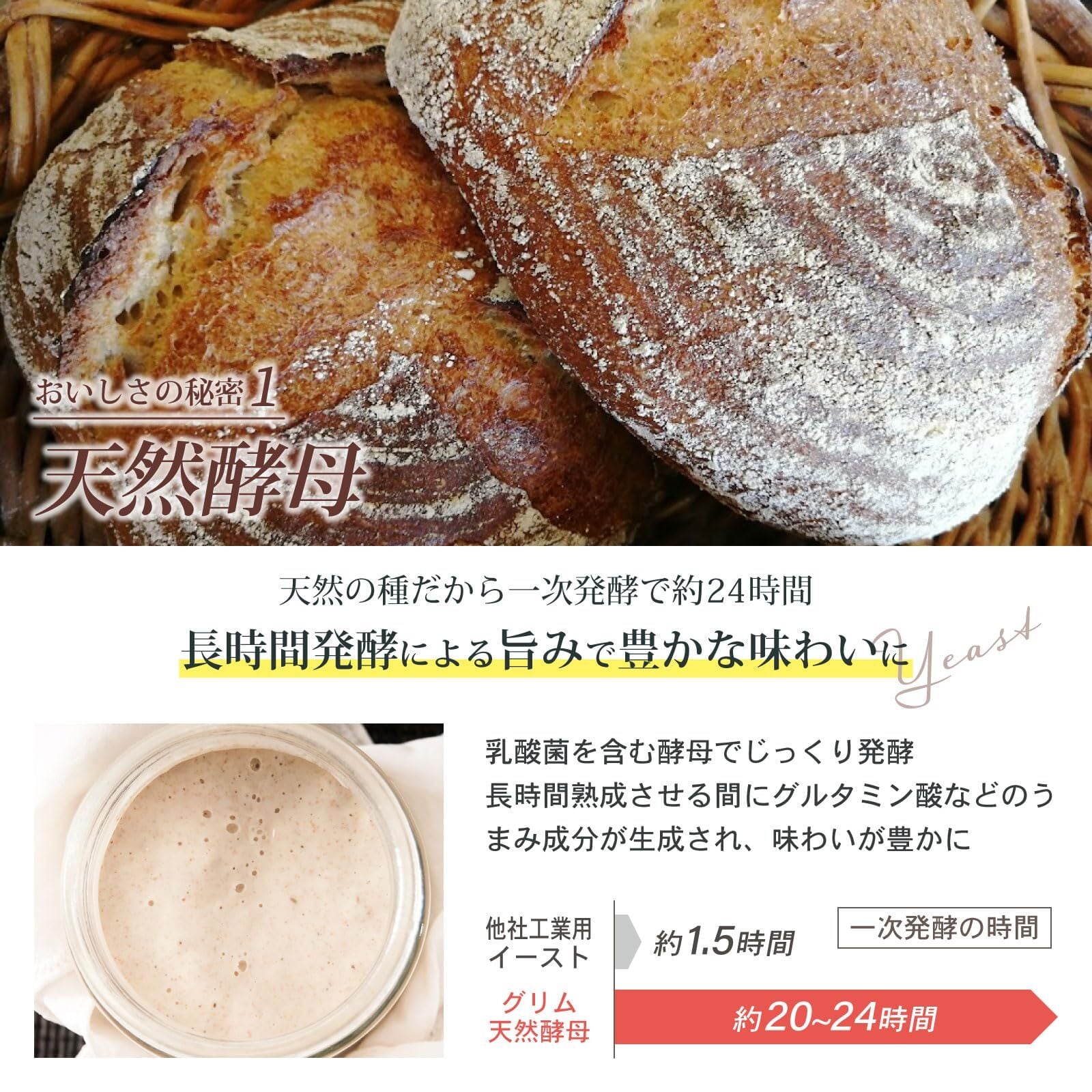 グリムの40年の歴史を誇る定番人気商品、「パン・ド・カンパーニュ」です。 当社は「安全・安心」をモットーに、厳選した粉を使用しているため、日常的に食するパンとして最適です。 フランス産小麦粉と北海道産ライ麦をブレンドし、ヒマラヤ岩塩および天然酵母のみを使用しています。余分な添加物は一切加えておりません。ライ麦には独特の酸味がございますが、天然酵母の乳酸菌の働きによって、その酸味はまろやかな風味に変化します。また、乳酸発酵と地元京都・亀岡市の弱酸性硬水を使用する事により、生地は弱酸性を保ち、雑菌の繁殖を防ぎ、長持ちするパンとなります。 このパンはスライスしてサンドイッチとして楽しむことができ、トーストしてバターやジャムを添えていただくことも可能です。また、日にちが経過して硬くなった場合は、ラスクなどに加工し、菓子感覚でお楽しみいただけます。 本来のパンの美味しさは、天然酵母の力を活用して長時間熟成させることで、小麦本来の旨みを引き出すことにあります。したがって、余分な添加物や複合物は一切必要ありません。天然酵母の力によって生地を低温発酵させることで、酵素が蛋白質を分解し、うま味成分であるアミノ酸を生成します。グリムの独自製法により、小麦の旨みを最大限に引き出し、安全で美味しいパンが実現しました。