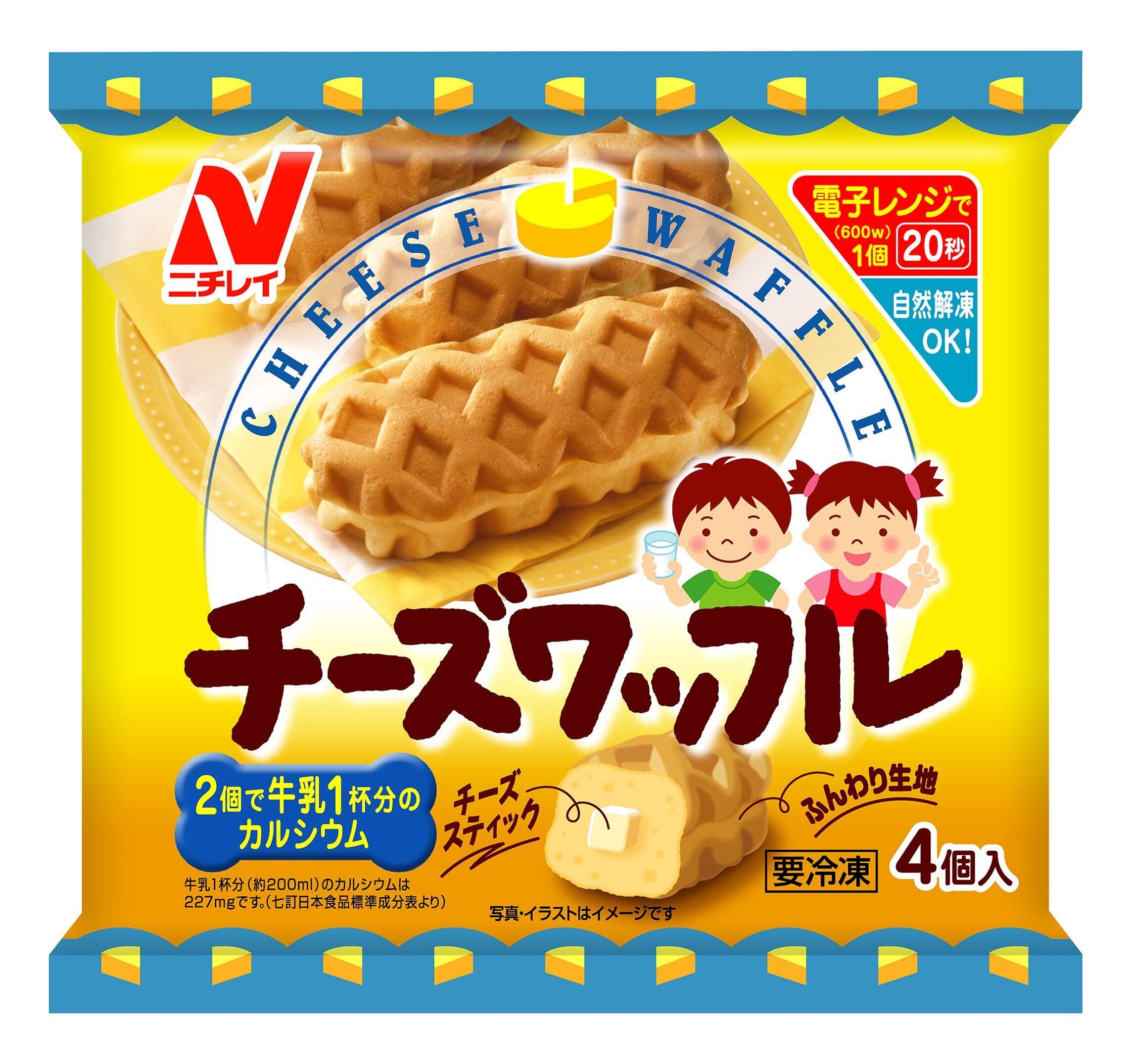 自社配合のふっくら生地にチーズをはさんだワッフルです。電子レンジで温めてるとふっくらとした、自然解凍ではひんやりしっとりとした食感の違いをお楽しみいただけます。お子さまのおやつや忙しい朝食などにもオススメです。2個で牛乳1杯分(約200ml)のカルシウムが摂れます。
