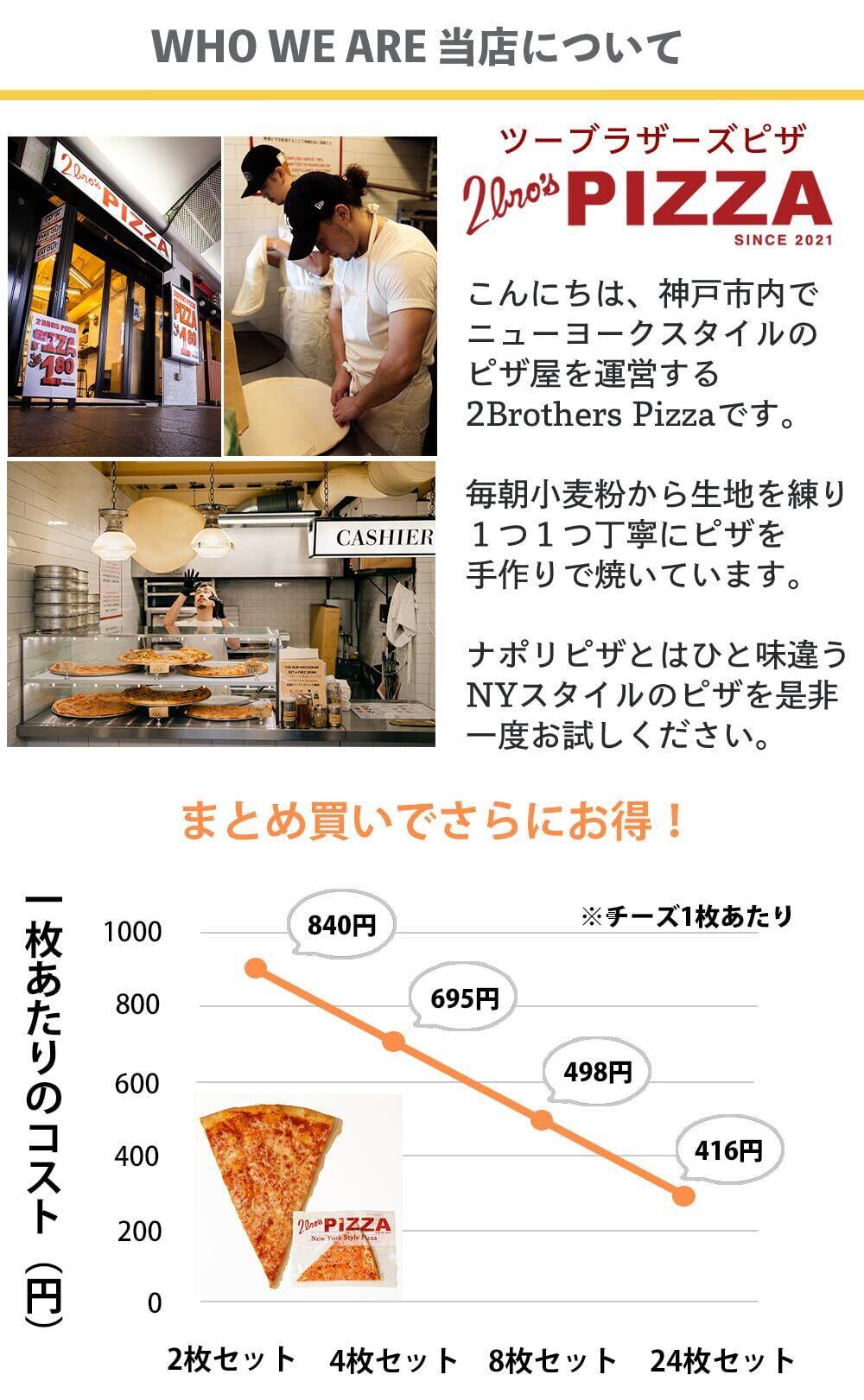 毎朝小麦粉からすべて手作り、24時間低温発酵させた生地でNY独特の旨みを引き出し、トロトロにとけるアメリカ産のモッツァレラチーズ100%を使用し、高温のオーブンでサクサクに仕上げ、本格のニューヨークピザを提供させていただいてます。 2枚から24枚入りのお得なセットからお選びいただけます。味を色々食べてみたい!という方々にもミックスのセットをご用意しております。 【こんなシチュエーションにおすすめ】ホームパーティーや忙しい日のお食事に、お子様のおやつ/お弁当、贈り物にも 【美味しい食べ方】オーブントースターまたはフライパンにフタをしてチーズがグツグツしだしたら出来上がり! 【保存方法】0℃以下 /ピザがお手元に届きましたらすぐに冷凍庫へお入れください。 【大きさについて】 1スライス約25cmのニューヨークスタイルピザ!2から24枚入りのお得なセットからお選びいただけます。 商品情報 名称 ニューヨークピザ 内容量 ピザ各約150~230 g 産地名 国産 種類 ニューヨークピピザ 消費期限 冷凍1年 保存方法 冷凍保存 加工業者名 〒650-0012 兵庫県神戸市中央区北長狭通り1丁目31-39,2Brothers Pizza