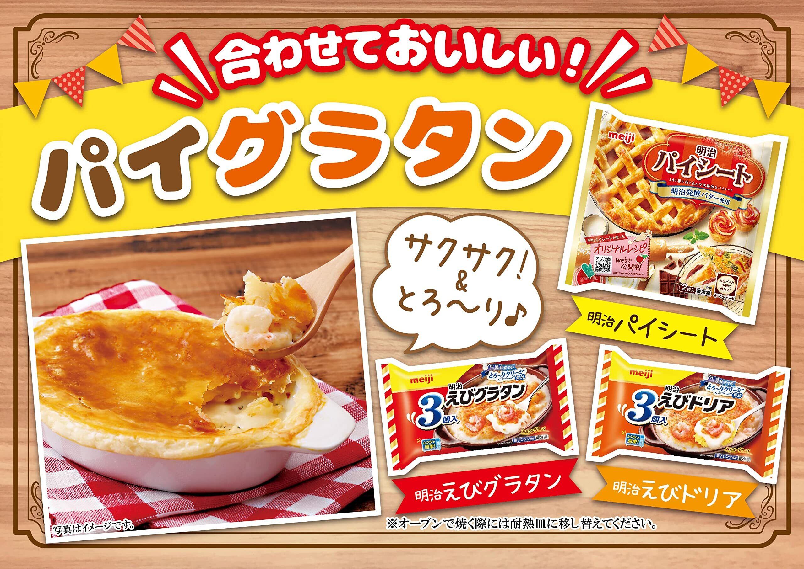 明治パイシートは、風味豊かな明治発酵バターを使った、144層に折り込んだ本格的なパイシートで安定してサクッとふっくら焼きあがります。ホールのアップルパイが作れる18cm×18cmの正方形。独自の配合による安定した焼きあがり。パイシートを活用としたオリジナルレシピも充実しています。