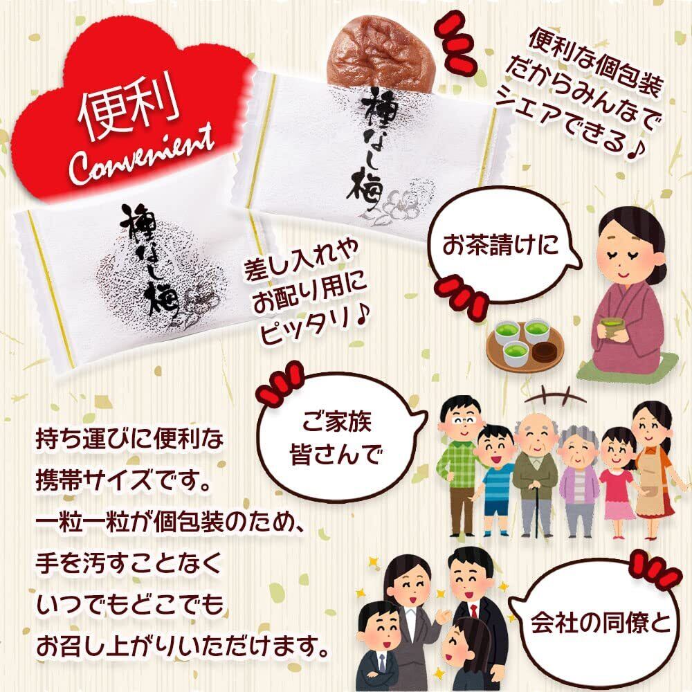 【商品詳細】種なしで幅広い年代の方でも食べやすく柔らかい食感。個包装で持ち運びに便利、屋外作業やスポーツ・登山時の塩分補給や熱中症対策にも。チャック付き袋に入れてお届け致します!
