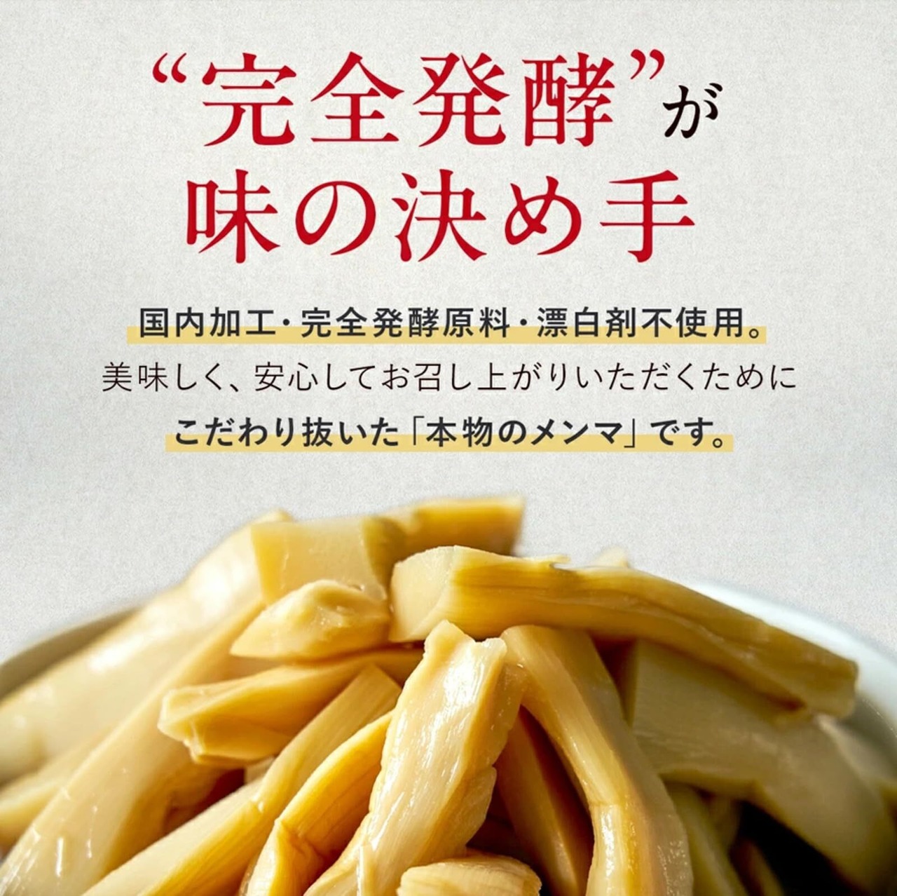 【商品へのこだわり】加工は、何と言っても安心な国内工場で徹底した衛生管理のもとで、メンマを作り続けています。「完全発酵原料」「漂白剤不使用」そして「国内加工」。それは美味しく、安心してお召し上がりいただける商品をお届けするためのこだわりです。
