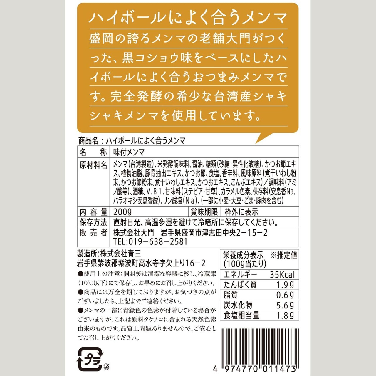 メンマ屋大門 おつまみ ハイボール によく合う メンマ 200g [魚介のうま味と黒胡椒のアクセント] 味付け 極太 肉厚 完全発酵原料 漂白剤不使用 国内加工