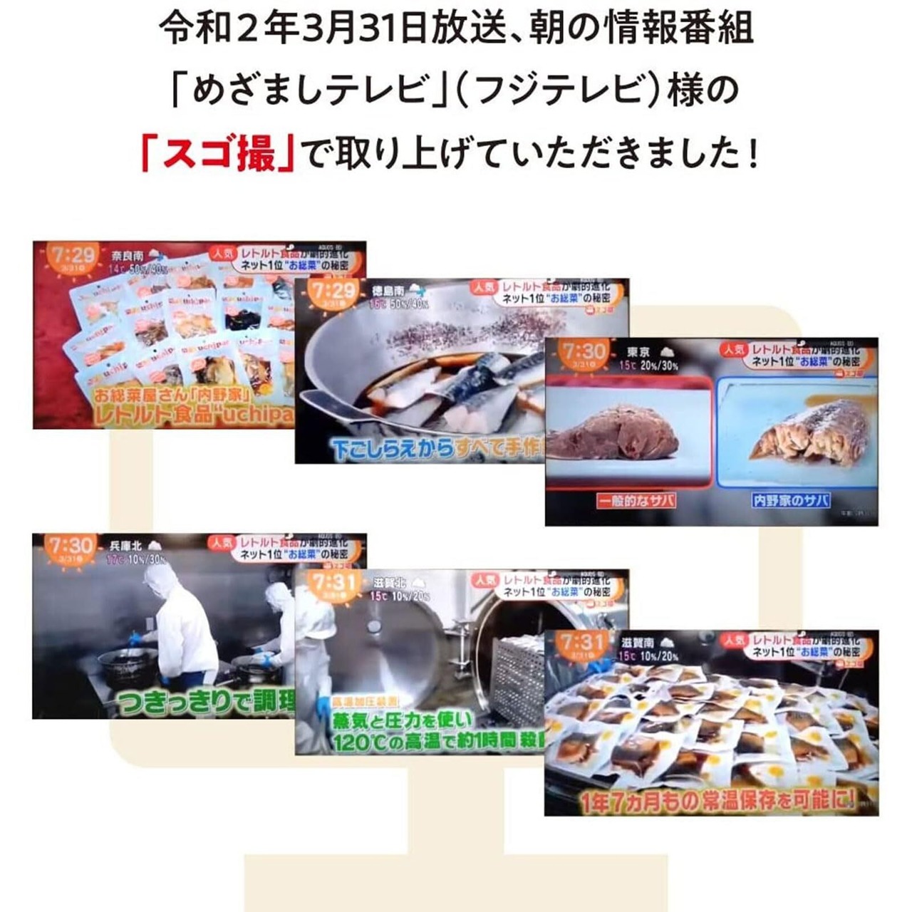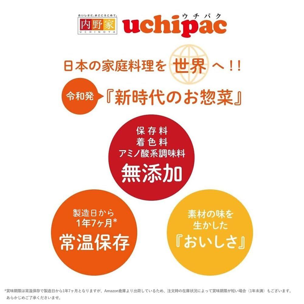 内野家(うちのや)のレトルト商品uchipac(ウチパク)シリーズから、人気の和食のお惣菜を全10品目セット(10種×各1個)にしました。