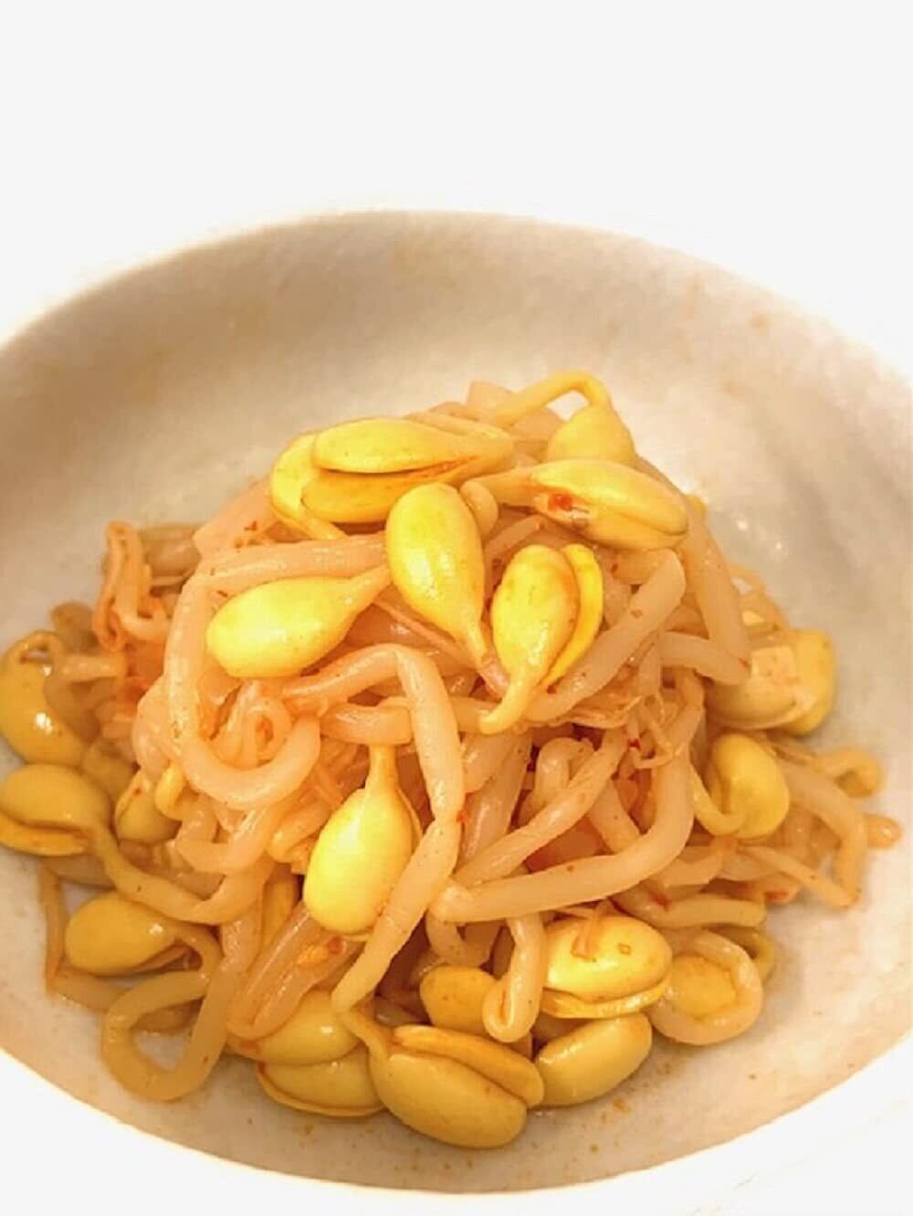 原材料:大豆もやし(国産)、食塩、食用植物油脂、砂糖混合ぶどう糖果糖液糖、ごま、唐辛子、香辛料、にんにく、でん粉、ぶどう糖/酸味料、調味料(アミノ酸等)、カロチノイド色素、pH調整剤、酸化防止剤(V.C)