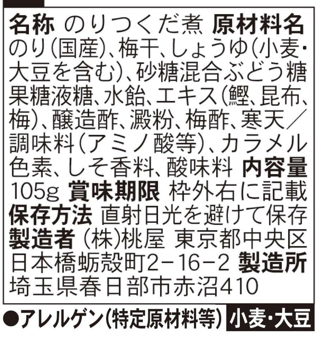 ■原材料:のり(国産)、梅干、しょうゆ(小麦・大豆を含む)、砂糖混合ぶどう糖果糖液糖、水飴、エキス(鰹、昆布、梅)、醸造酢、澱粉、梅酢、寒天/調味料(アミノ酸等)、カラメル色素、しそ香料、酸味料