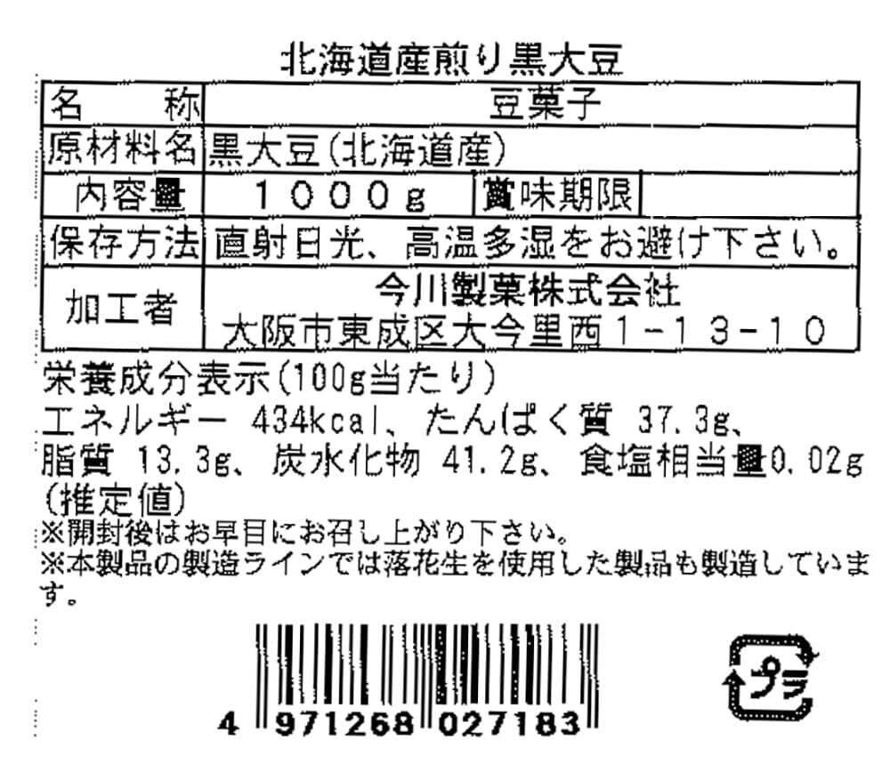 今川製菓 北海道産煎り黒大豆 ソフト焙煎 無添加 黒豆 食塩不使用 業務用 大容量 (黒大豆) 福豆 節分 豆(1kg)