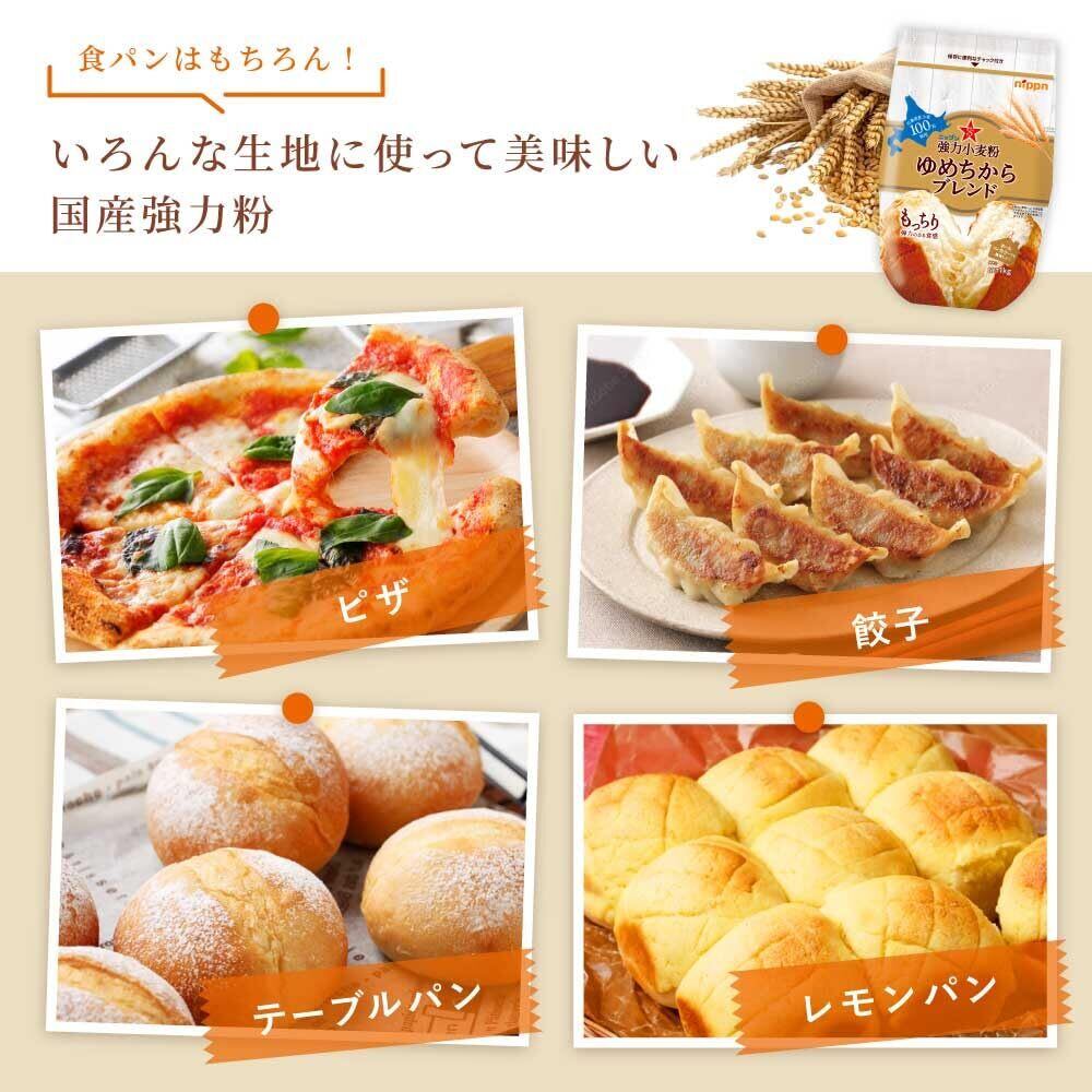 「ニップン ゆめちからブレンド強力小麦粉」は国産(北海道産)小麦「ゆめちから」を使用した、北海道産小麦100%の強力粉です。超強力小麦のゆめちから主体だから実現できた「ボリューム感」と「もっちりとした弾力」、北海道産小麦の自然な甘みともっちりとした食感をお楽しみいただけます。パン用強力粉としてお使いいただくのがおすすめです。保存に便利なチャック付き。