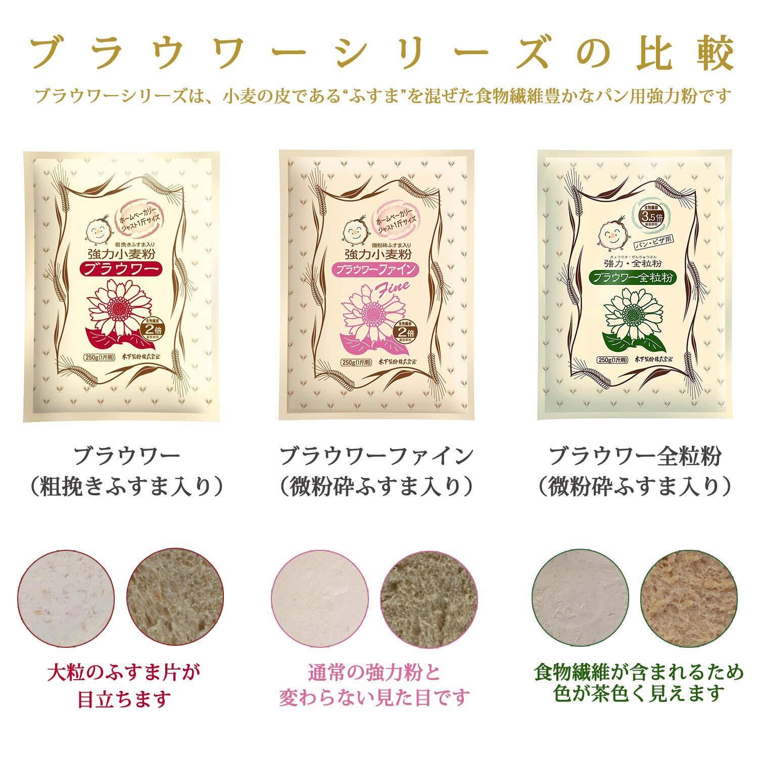 ひまわり(強力粉)、ブラウワー(粗挽きふすま入強力粉)、ブラウワー全粒粉の3種類の異なる強力粉が入っています。また3種類ともHBジャスト1斤サイズ(250g)です。