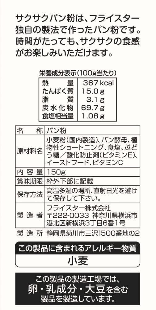 パン粉は、水分含有量の違いから“乾燥パン粉"と“生パン粉"に分けられます。当商品は乾燥パン粉なので 賞味期間が長く、保管が容易のうえ、焼きたてのパンのように香ばしい風味とソフトな口当たりです。当社独自のクリスプ製法で製造し、時間がたってもサクサクの食感をお楽しみいただけます。レンジで温めなおしてもおいしく召し上がれます。保存に便利なチャック付き。トンカツ、エビフライ、コロッケのようなフライ料理から、ハンバーグ、グラタンなど幅広くお使いいただけます。