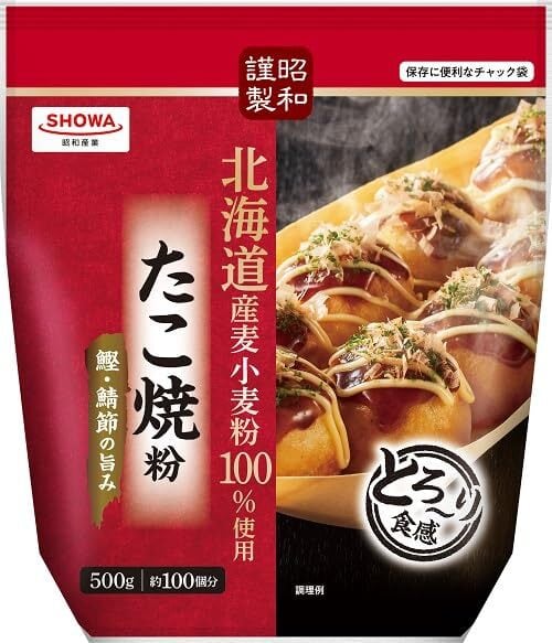 北海道産麦小麦粉を100%使用したたこ焼粉で、中がとろ~り食感のたこ焼が作れます。