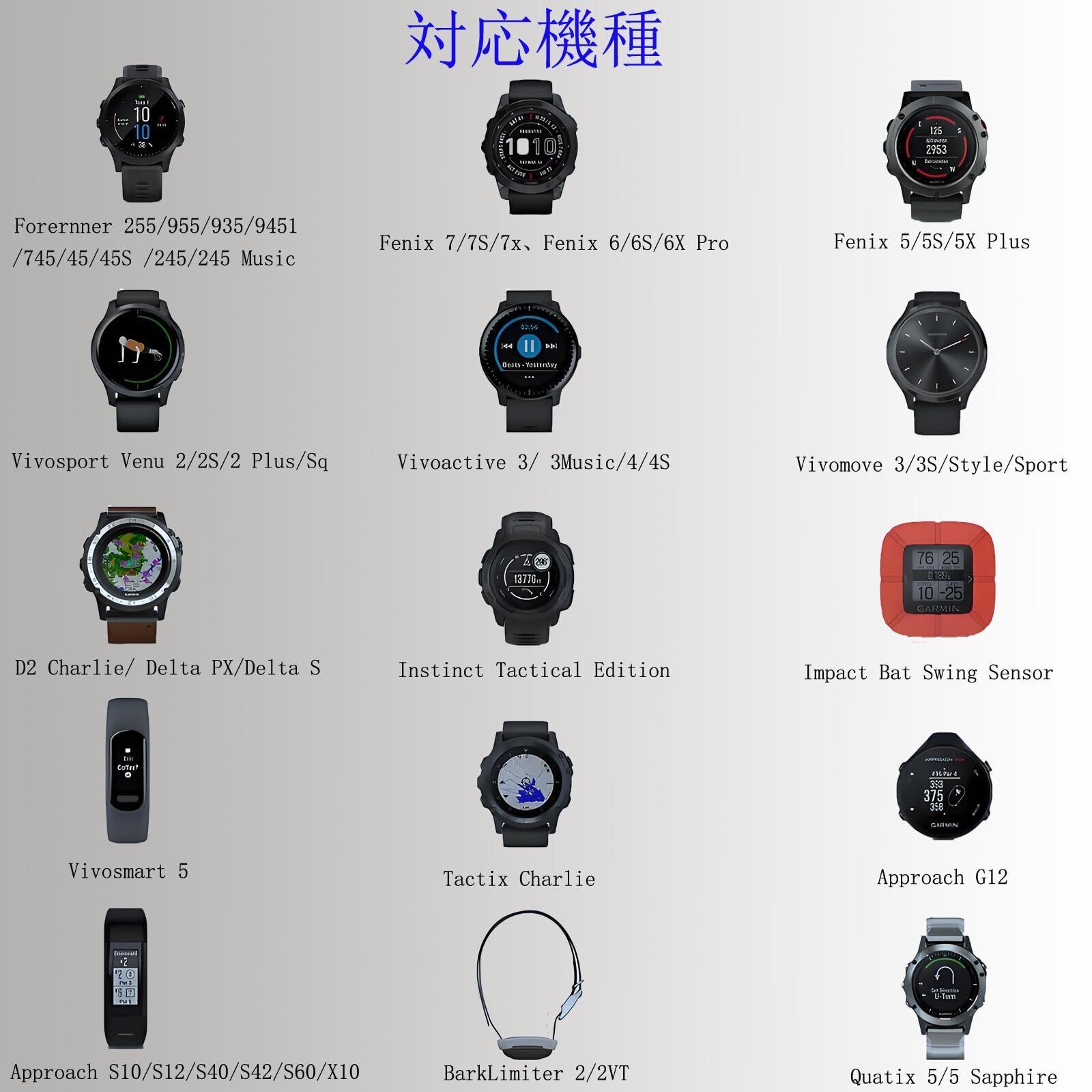 Garmin Fenix 7 7S 7X、Fenix 6 6S 6X Proおよびサファイアエディション、Fenix 5 5S 5X Plus、Epix (Gen 2)、Vivosmart 5、Forerunner 255 955 935 945 745 45 45S 55 245 音楽、アプローチ S10 S12。 S40 S。 42 S60 X10…