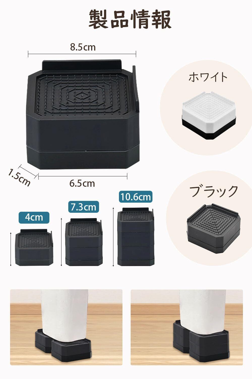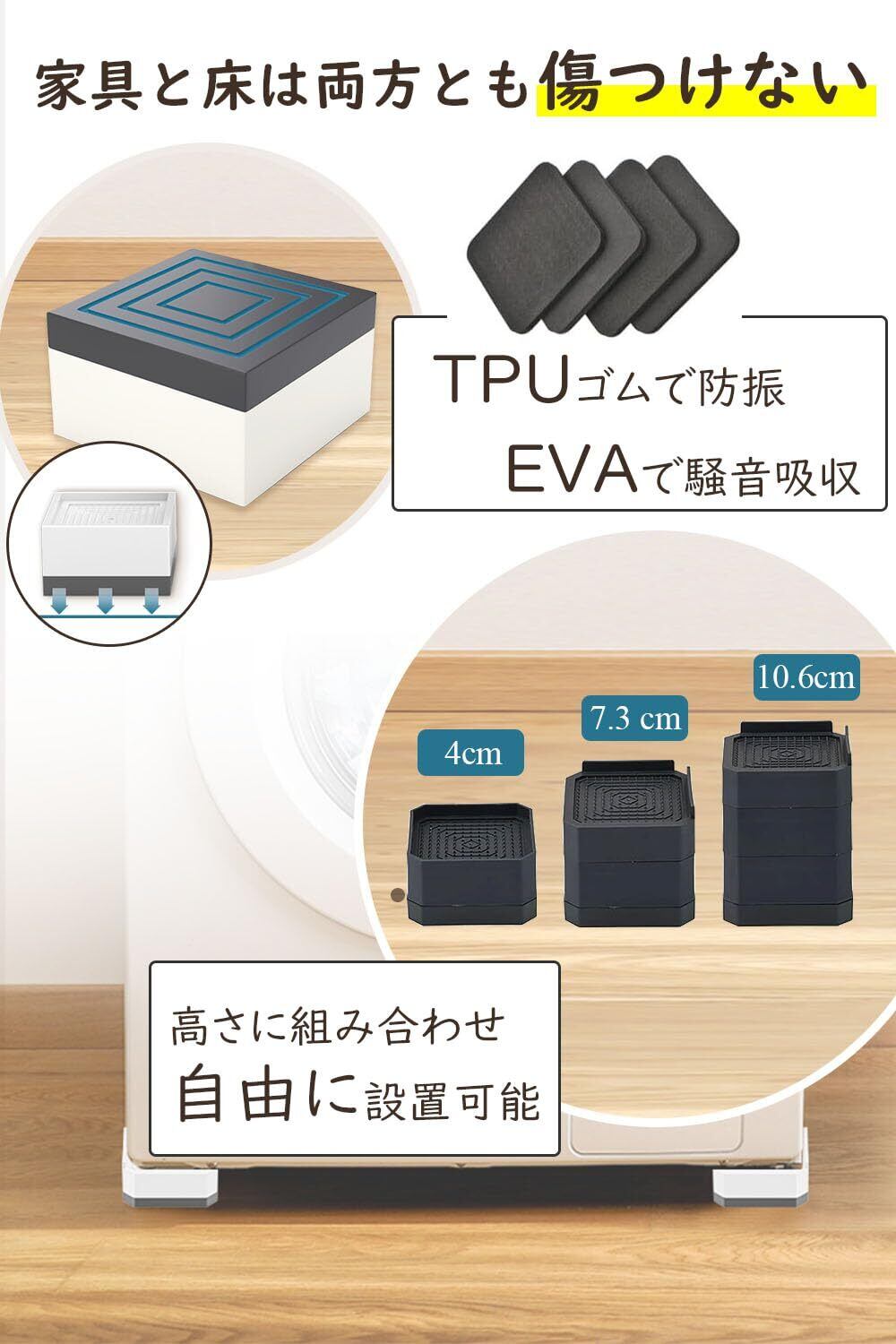 【幅広い用途・安定感バッチリ】洗濯機だけでなく、冷蔵庫、ベッド、ソファ、テーブル、棚などの家具や家電製品の台、高さ調整にご活用できます。セット内容:4個入り。耐荷重:約2000kg(4個使用時)。※適用対象:丸足の直径/矩形足の最長辺が79mm内、85cm以上はつなぎ合わせる必要があります。
