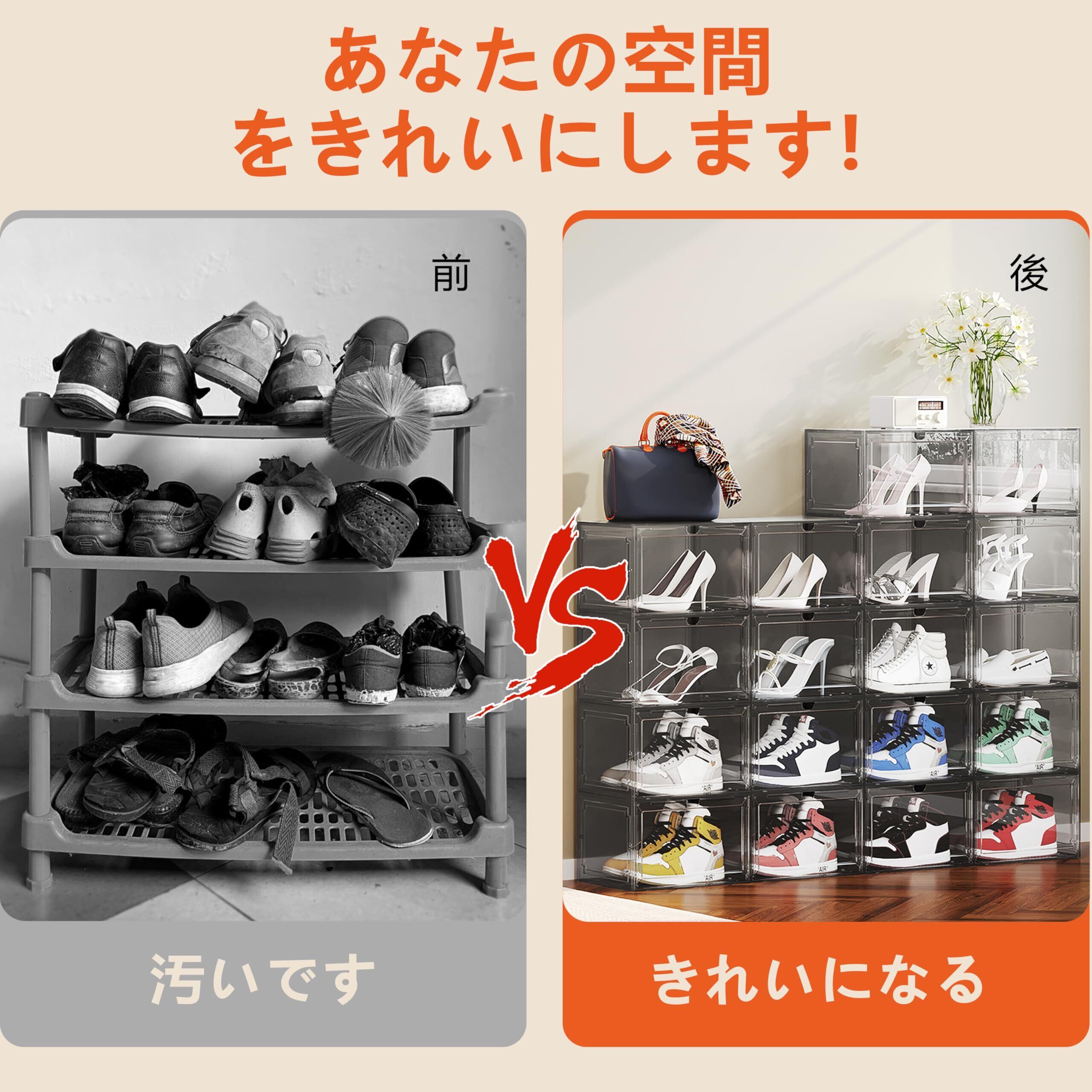 【クリアな視界】 透明度が高く、美しいデザインのこのシューズボックスは、靴だけでなく衣類やぬいぐるみ、トイレタリーなども魅力的に展示できます。既存のインテリアと調和しながら、おしゃれな空間を創造します。