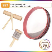 カバサ、ウッドブロック、オーシャンドラム (タンバリン)のパーカッション 楽器の3点セット。大人から子供まで手軽に音楽を楽しめる打楽器で、みんなでリズムにのって音楽を楽しんだり、室内ライブにもおすすめ