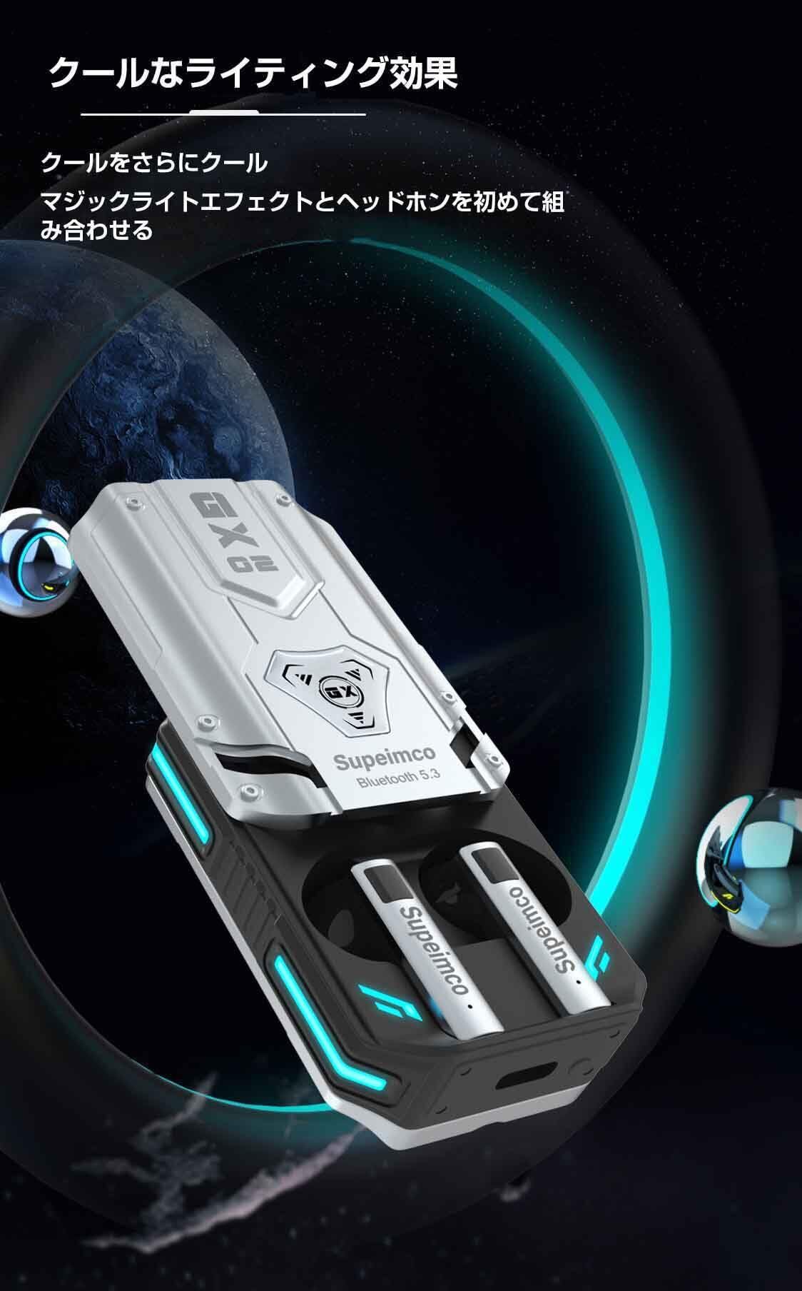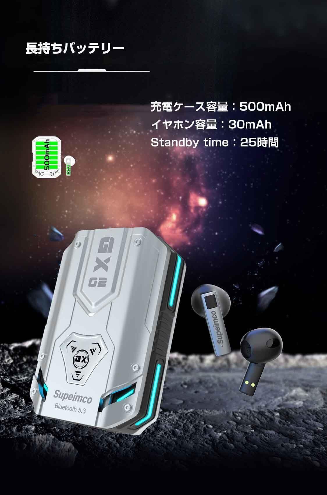 【宇宙空間を思わせる充電ケース】ケース開閉時には宇宙空間を思わせる効果音「シャキーン」と残量を光で表示させる新感覚のイヤホンです。いつでもどこでも充電ケースの残量、またイヤホンの充電状況が一目瞭然!【驚嘆した連続待機時間】イヤホン単体をフル充電すればで5時間以上再生でき、通勤や通学などで時間を気にせず音楽を楽しめます。充電ケースと組み合わせて25時間以上再生でき、長い時間充電せずに使えるので便利です。(※電池劣化を防ぐため、長時間に使用しない場合、定期的に充電ケースに給電してください。)