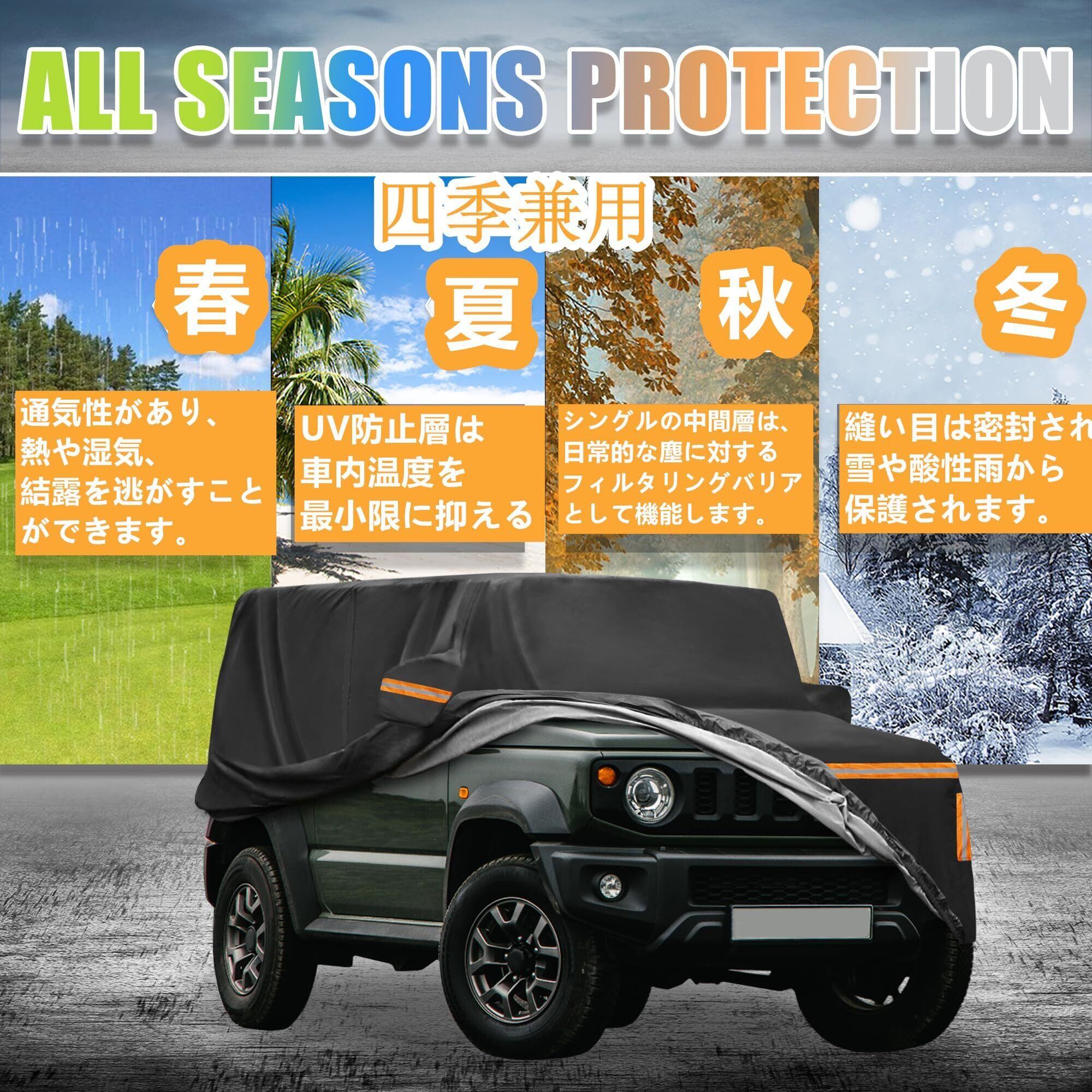 X AUTOHAUX 【ジムニー専用】 スズキに対応 シエラ JB23/JB33/JB43/JB53/JB64/JB74 1998-2023車カバー 軽自動車カバー 遮光断熱 日焼け防止 雹対策 全天候型防水 カーカバー ボディカバー 屋外防塵 防雪 防輻射 紫外線 UVカット 耐強風 1セット 車両カバー 防風 運転側ジッパー付き ブラック 反射テープ