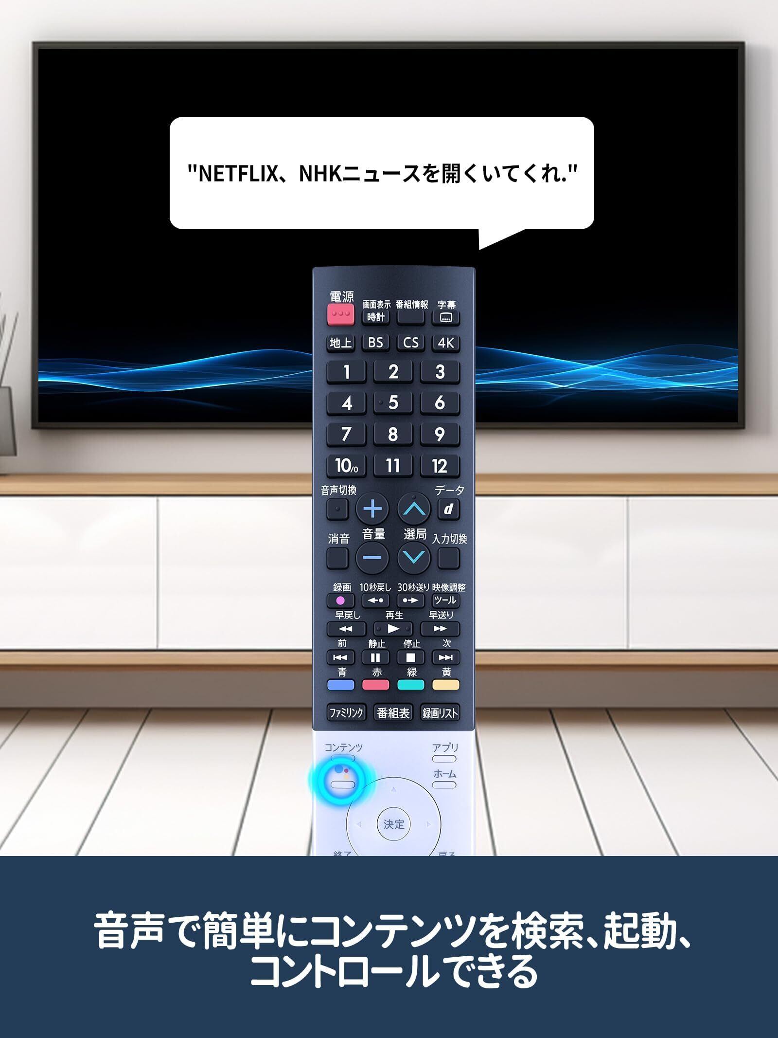 【音声認識機能付き】リモコンは音声検索が可能で、音声認識ボタンを押しながらリモコンに話しかけることで、好きなタイトルの検索や再生を操作することができます。