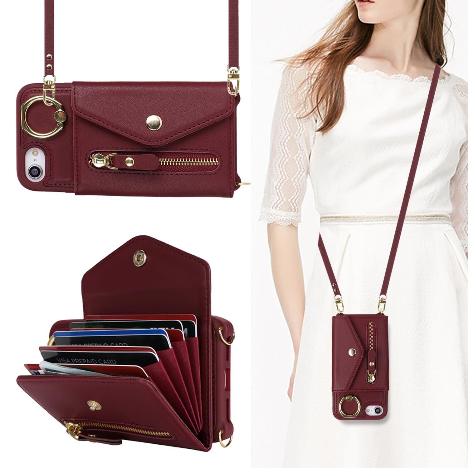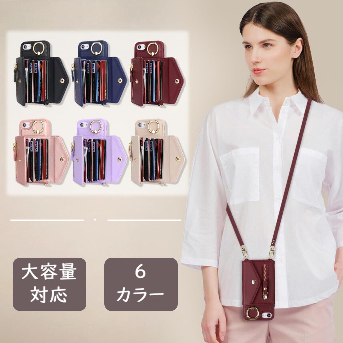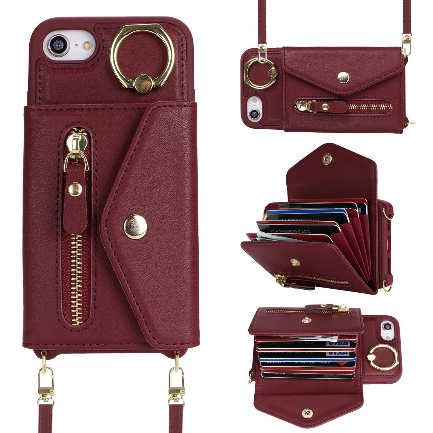 【Hamany】 iphone se ケース オシャレ ショルダー iphonese第3世代 ケース カード収納 大容量 iphone8 ケース 手帳型 リング付き スマホカバー 耐衝撃 全面保護 スタンド機能 iphone7ケース 肩掛け 斜めかけ カバー -ワインレッド
