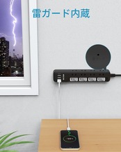 【雷ガードタップ・安心】雷ガード機能を搭載しており、雷サージによる接続機器への被害防止に有効です。耐熱性に優れた素材を使用しており、トラッキング・火災の防止に有効です。