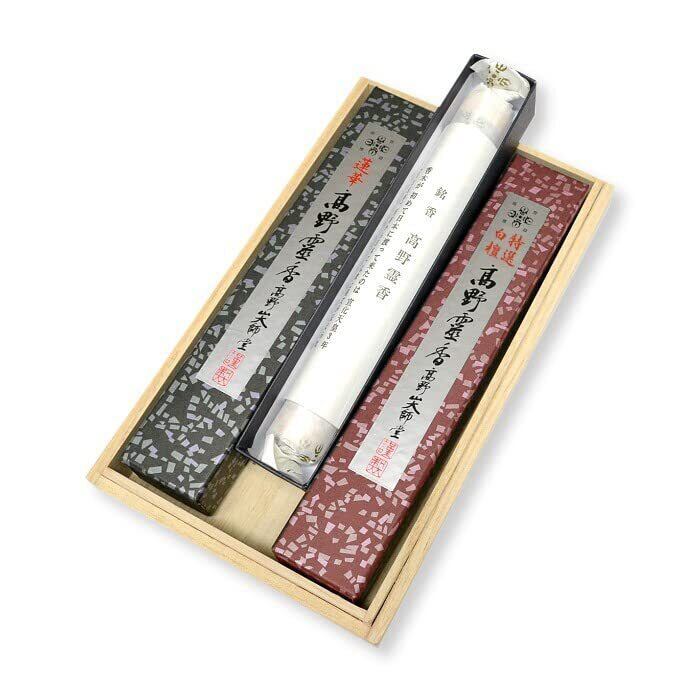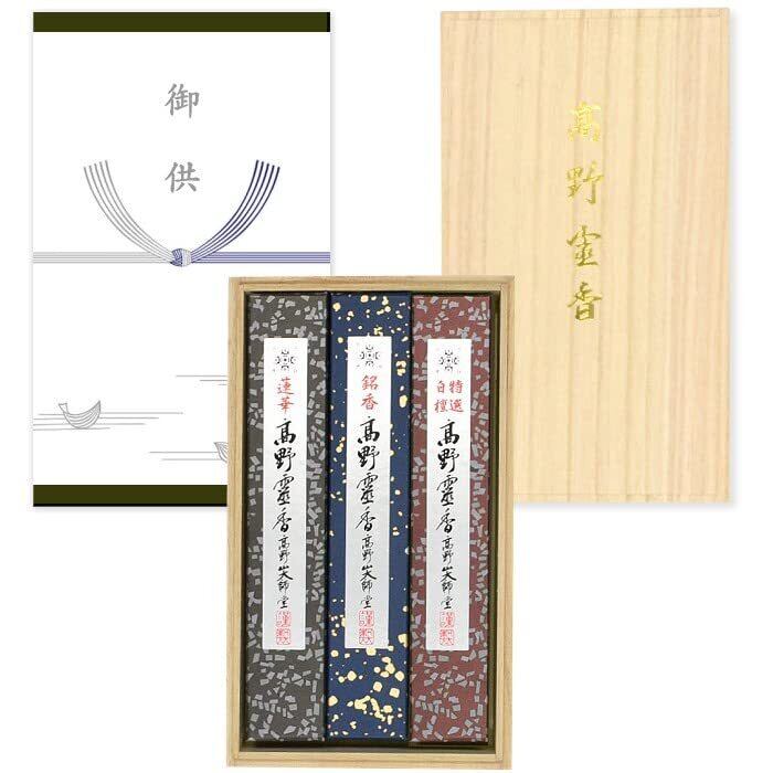 高野霊香の贈答用セット: この商品は、桐箱入りの贈答用セットで、特別な贈り物として最適です。桐箱にはお供えのしが付いており、『御供』とだけ印刷されています。御霊前や御仏前などのお悔やみ事全般にお使いいただけます。