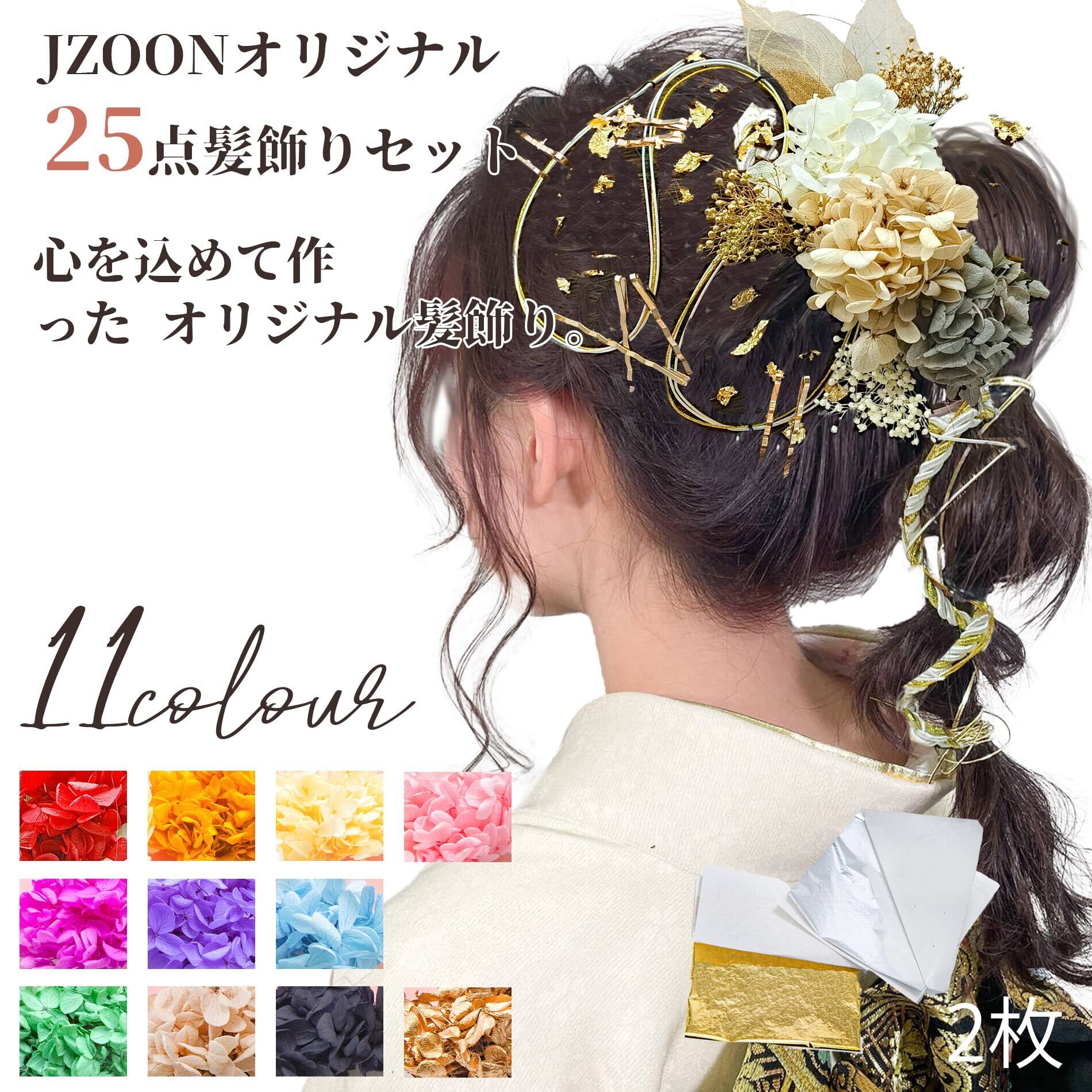 【上品な髪飾りセット】合計で25点の上品な髪飾りで、11色がをご選択いただけます。ア ジサイ、水引、かすみ草、金箔を散りばめ、その他葉っぱと組紐の合わせて、ボリューム感や 色彩のバランスよく、女性の美しさをアピールできます。エレガントに溢れる髪飾りで重要な 日を誰よりも輝いています。