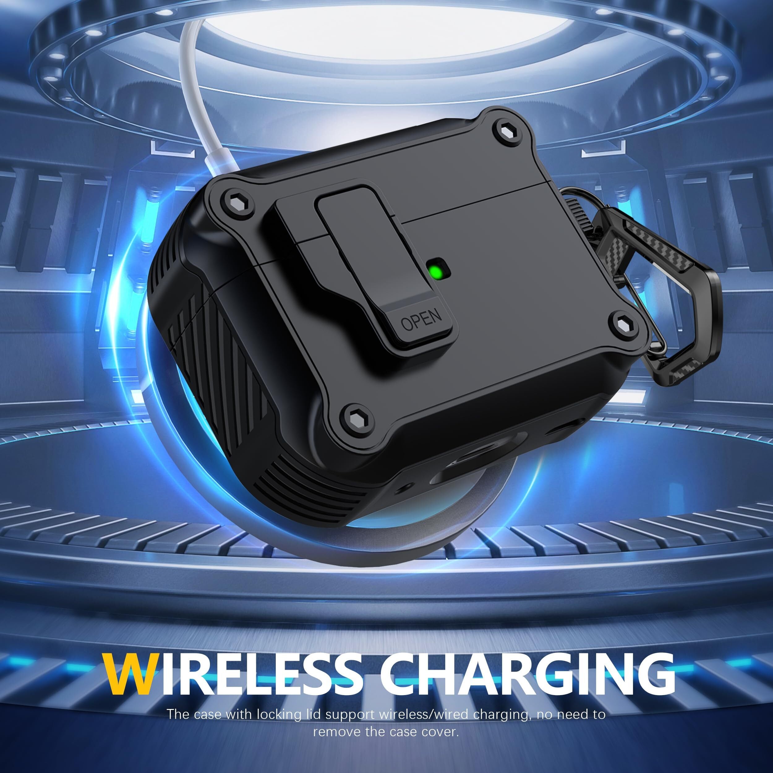 【ユニークなセキュリティロックと自動ポップアップ】アップグレードされたセキュリティロック設計により、開閉が簡単になります。「OPEN」ボタンを押すと、ケースの上部が自動的に開きます。 AirPods 充電ケースをしっかりと閉じた状態に保ち、カバーが落ちることを防ぎます。