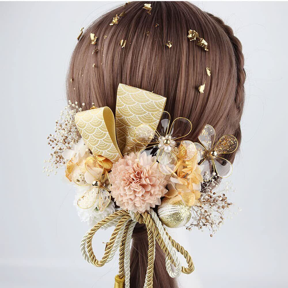 レディス 髪飾り 花嫁ドライフラワー 造花 髪飾り 花飾り ドライフラワー 15点セット 成人式 卒業式 結婚式 袴 和装 浴衣 髪飾り (ゴールド)