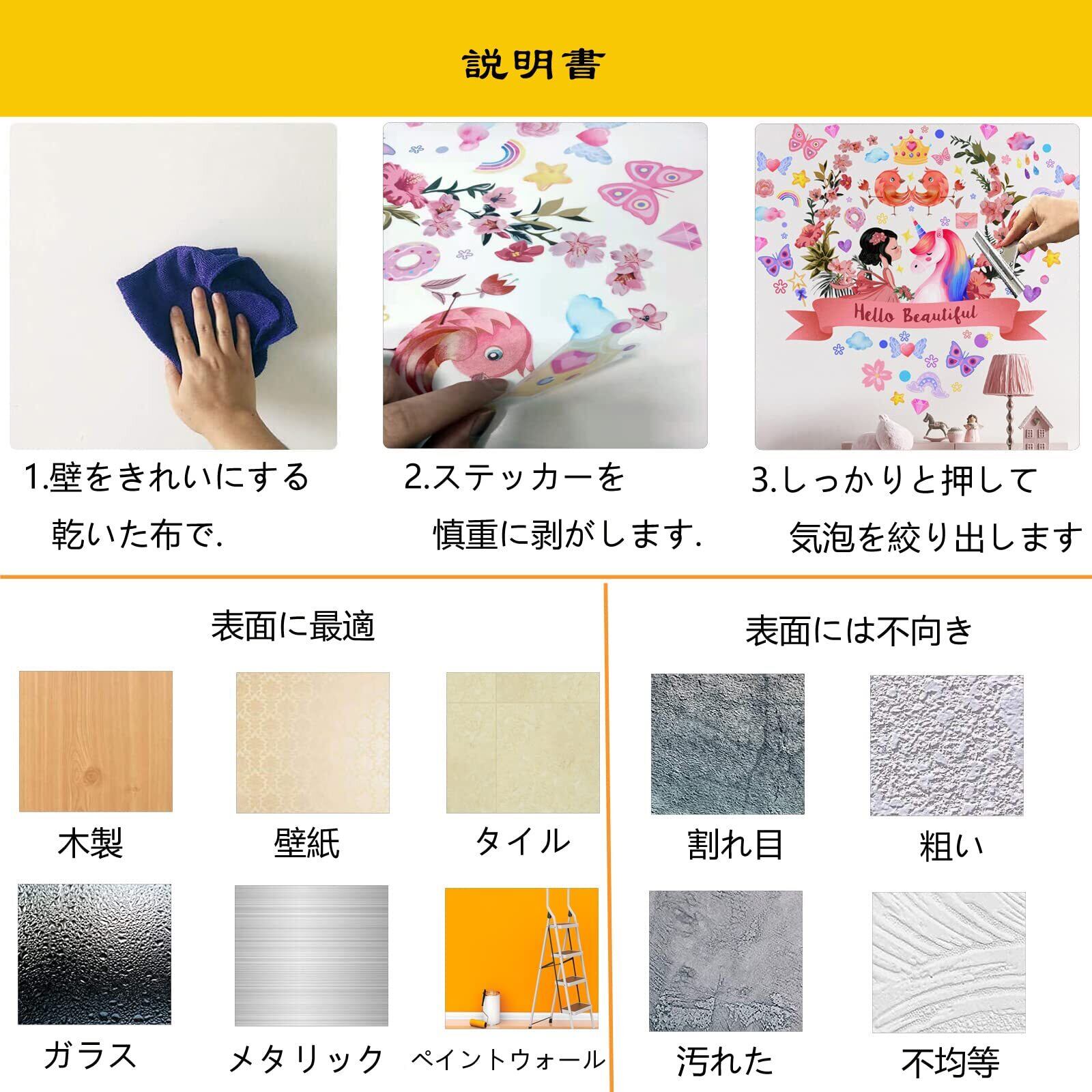 適用が簡単で、ペーストパターンを直接はがして、好きな場所に貼り付けます。壁、鏡、キャビネット、家具、窓、冷蔵庫、ガラス、ドアなど、清潔で平ら、乾燥した、滑らかで表面に適しています。