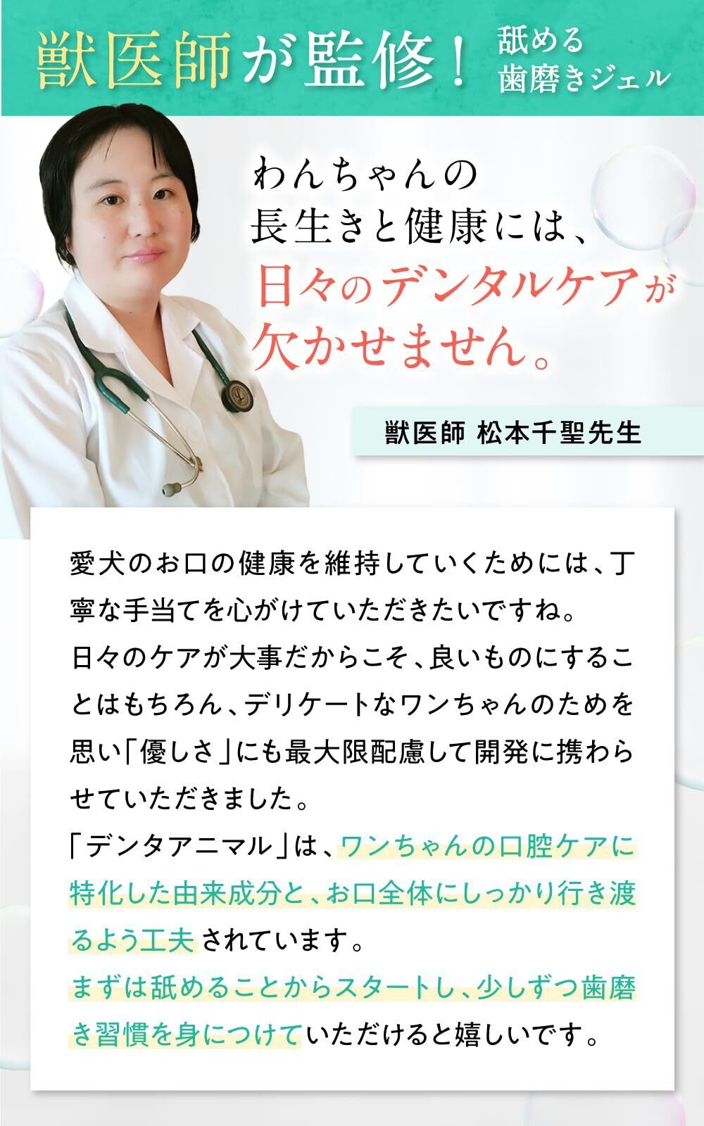 【獣医師監修舐める歯磨きジェル 】動物の専門家である獣医師が監修した成分設計で、愛犬のデリケートな口内に優しい配合になっています。舐めるだけで歯のケアができること。愛犬が自然と舐めたくなるフレーバーを使用しているため、歯ブラシが苦手な子でも安心。動物の専門家の視点で開発された、舐める歯磨きジェルで毎日の口腔内ケアができます。