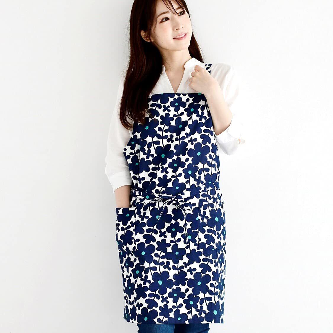 [レップ] エプロン 北欧 ポケット2個付き 花柄 大人用 カフェエプロン 着丈73cm (アビチュアル セルマ) ブルー 1056 BL プレゼント