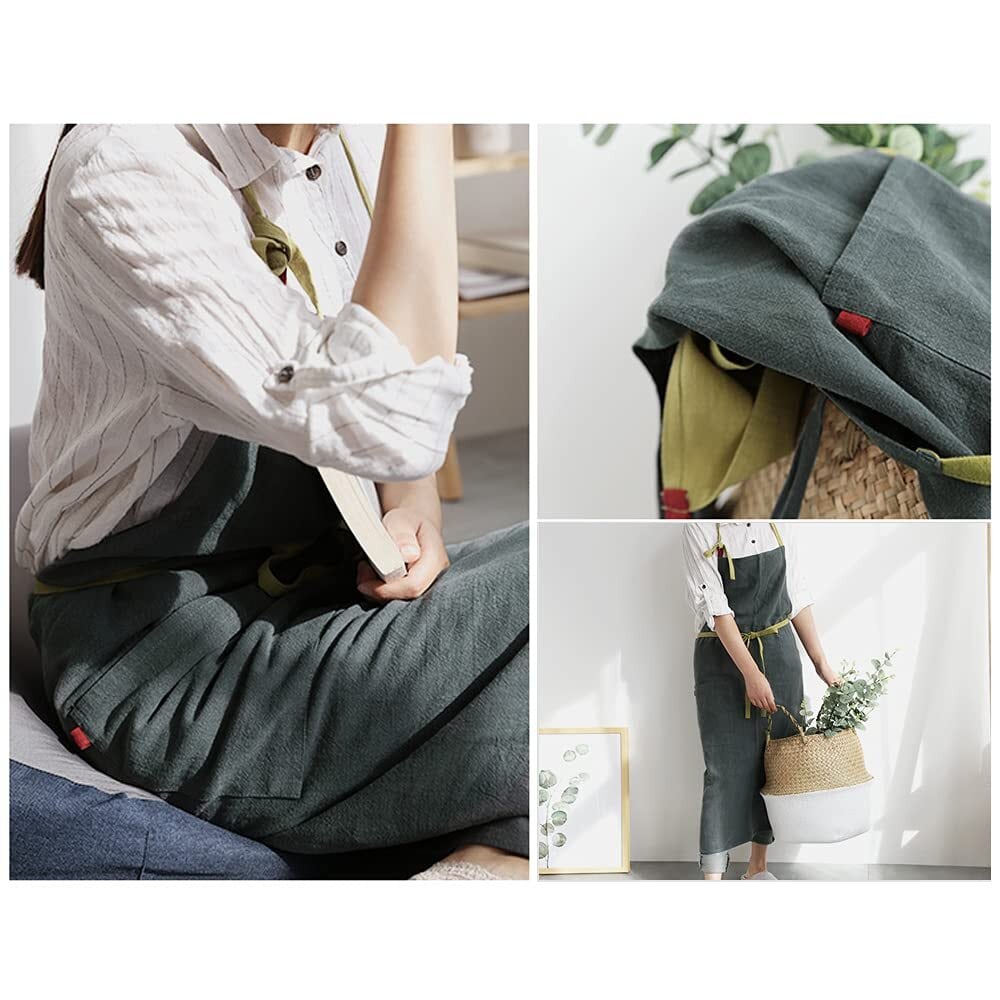 【高品質-リネン エプロン レディース】(麻)30%、綿70%、非常に柔らかく肌に優しいエプロンを採用。使うほど韻味があり、麻特有の垂順な質感がとてもおしゃれです!シンプルなデザインで、このエプロンのスタイリッシュなデザインは、細長いウエストと首の曲線を特徴とし、女性的で美しい外観を演出しています。