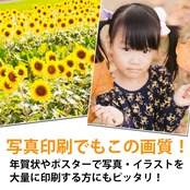 【純正品と遜色のない、美しいカラー】 年賀状やポスターなど、カラーインクをたくさん使う方もぜひ当社互換インクをお試しください。イラストや写真の色合いや鮮明さは純正品と同レベルの美しさ。もちろん文字もくっきりと印刷できます。 商品の仕様